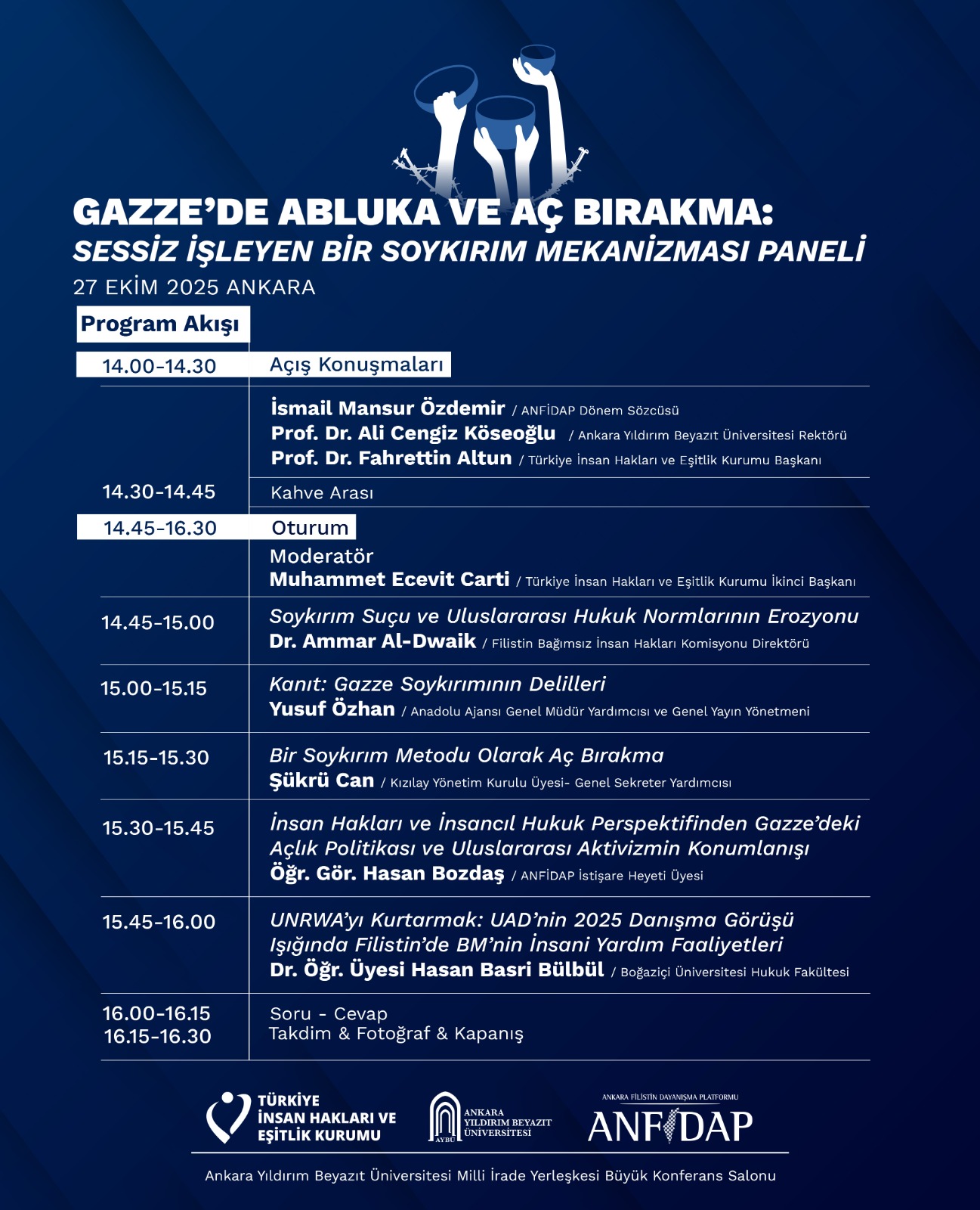 Ankara Yıldırım Beyazıt Üniversitesi ve Ankara Filistin Dayanışma Platformu (ANFİDAP) ve TİHEK iş birliğiyle 27 Ekim 2025 tarihinde saat 14.00’te Ankara Yıldırım Beyazıt Üniversitesi Milli İrade Yerleşkesi Büyük Konferans Salonu’nda “Gazze’de Abluka ve Aç Bırakma: Sessiz İşleyen Bir Soykırım Mekanizması” başlıklı panel düzenlenecektir.