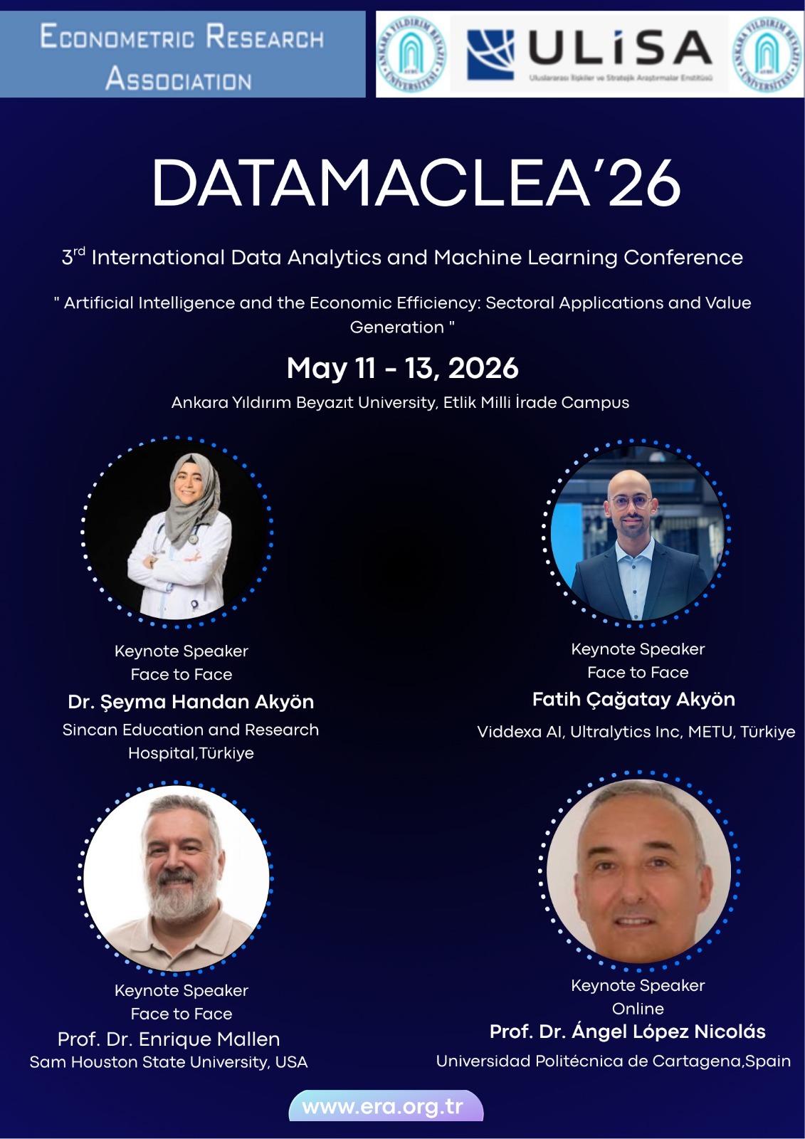 Econometric Research Association (ERA) is excited to unveil the 3rd International Data Analytics and Machine Learning Conference DATAMACLEA’26 (face to face or online) dedicated to exploring the forefront of data analytics and machine learning. ERA will cooperate with Ankara Yıldırım Beyazıt University, Institute for International Relations and Strategic Research, (ULISA) during the event. Both English and Turkish articles are welcomed for the Conference. This year’s main topic which is " Artificial Intelligence and the Economic Efficiency: Sectoral Applications and Value Generation " can be summarized as follows: