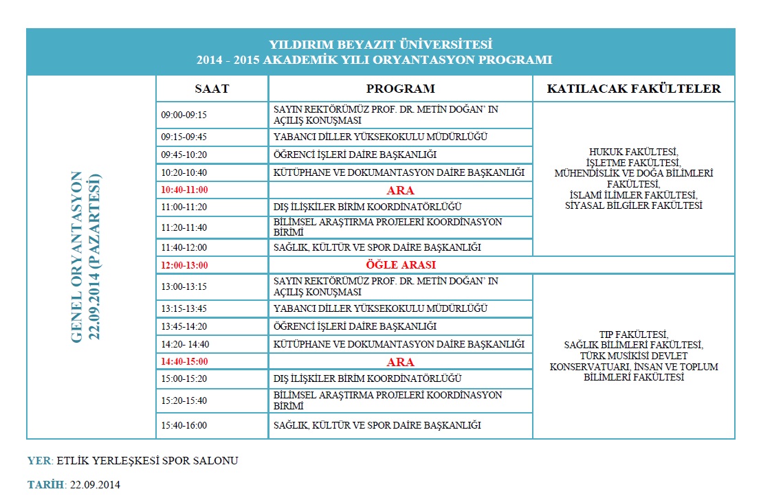 2014-2015 Akademik Yılı Oryantasyon Programı 22 Eylül Pazartesi günü Etlik Yerleşkesi Spor Salonunda gerçekleştirilecektir.