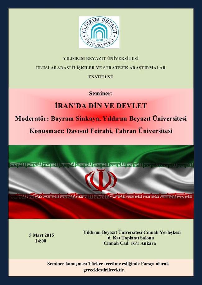 Uluslararası İlişkiler ve Stratejik Araştırmalar Enstitüsü(ULİSA) tarafından organize edilen, “İran’da Din ve Devlet” konulu seminerimiz 5 Mart 2015 tarihinde saat 14.00’da Tahran Üniversitesi’nden Davood Feirahi’nin katılımı ve üniversitemiz öğretim üyesi Yrd. Doç. Dr. Bayram Sinkaya’nın moderatörlüğü ile Üniversitemizin Cinnah Yerleşkesinde gerçekleştirilecektir. Seminer Türkçe tercümeli Farsça olacaktır. Seminerimize üniversitemizin tüm öğretim elemanları ve öğrenciler davetlidir.