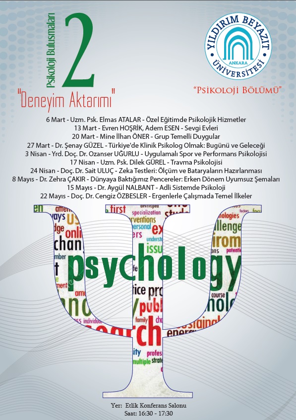 İnsan ve Toplum Bilimleri Fakültesi Psikoloji Bölümü tarafından organize edilen, “Psikoloji Buluşmaları 2: Deneyim Aktarımı" isimli seminer dizisinin ilki, 6 Mart 2015 tarihinde saat 16.30’da, Uzm. Psk. Elmas ATALAR'ın katılımıyla "Özel Eğitimde Psikolojik Hizmetler" başlığı ile, Üniversitemizin Etlik Konferans Salonunda gerçekleştirilecektir. Seminerlerimiz dönem boyunca alanında uzman isimlerin, kendi çalışmalarıyla ilgili deneyimlerini aktardıkları toplantılar ile devam edecektir.