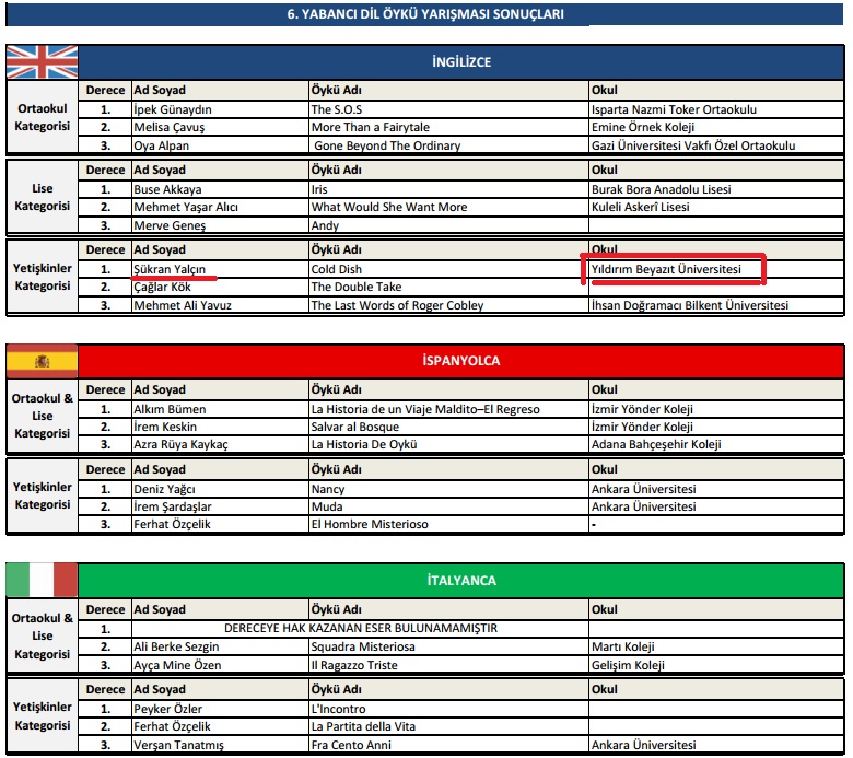 Üniversitemiz hazırlık programına devam eden öğrencilerimizden Şükran Yalçın, Nüans Kitabevi tarafından düzenlenen 6. Ulusal Yabancı Dil Öykü Yarışması İngilizce dalında Türkiye birinciliği alarak İngiltere’de İngilizce kursu ödülü kazanmıştır. Öğrencimize başarılarından dolayı tebrik eder, üniversitemizi başarıyla temsil etmiş olduğu için kendisine teşekkür ederiz.