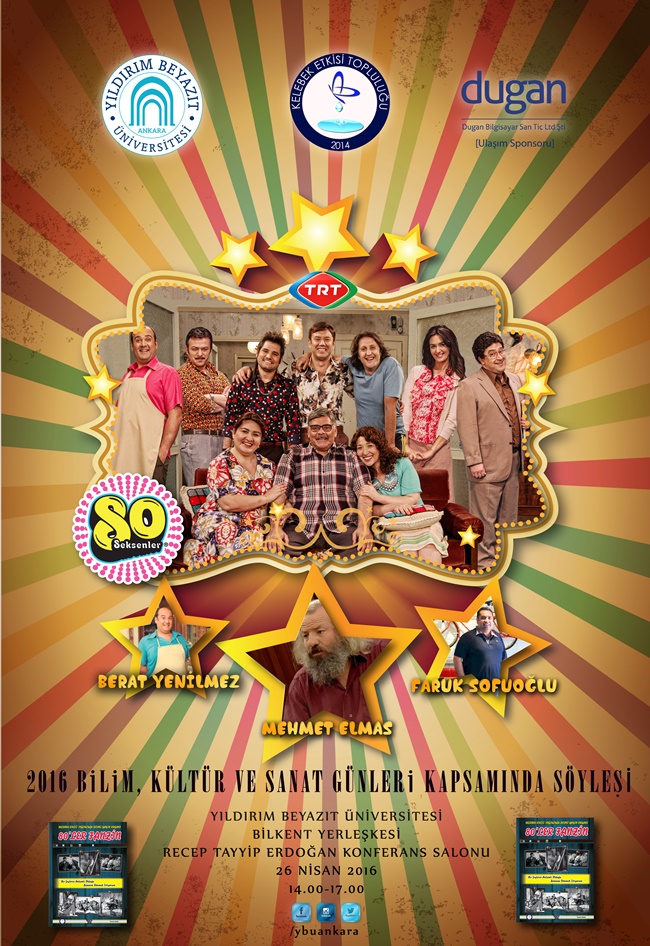Üniversitemiz Kelebek Etkisi Öğrenci Kulübü organizasyonunda TRT kanalının sevilen dizisi Seksenler oyuncularından Mehmet ELMAS, Berat YENİLMEZ ve Faruk SOFUOĞLU 2016 Bilim, Kültür ve Sanat Günleri kapsamında 26 Nisan 2016 Salı günü 14.00'te Bilkent Yerleşkemizde Seksenler Fanzin açışı ve söyleyişi gerçekleştireceklerdir.