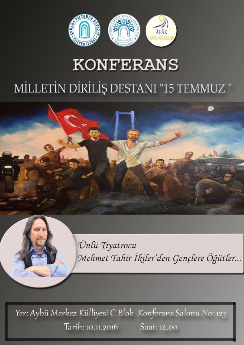 Üniversitemiz Öğrenci Konseyi ve Afak Öğrenci Kulübü organizasyonunda Esenboğa Külliyemiz C Blok Konferans Salonunda ünlü tiyatrocu Mehmet Tahir İkiler'in katılımıyla Milletin Diriliş Destanı "15 Temmuz" konferansı gerçekleştirilecektir.