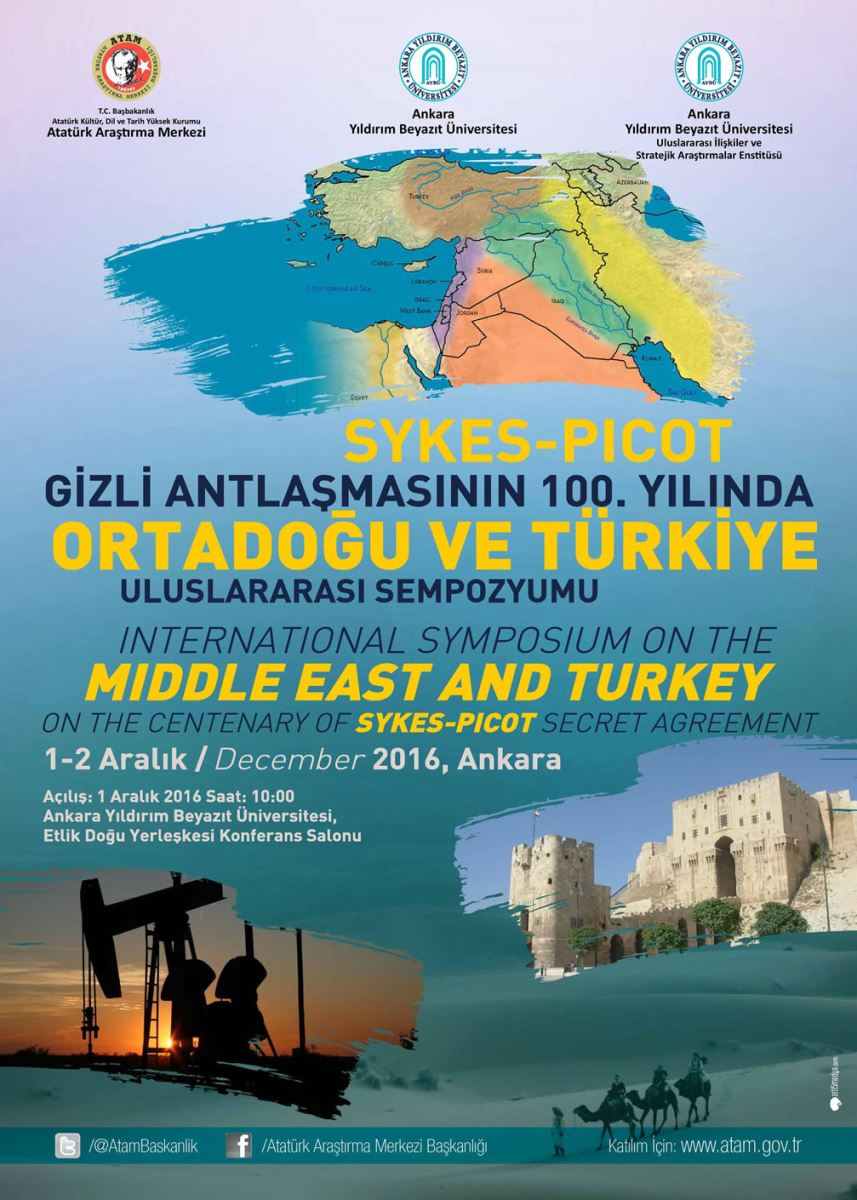 Üniversitemiz Uluslararası İlişkiler ve Stratejik Araştırmalar Enstitüsü ile T.C. Başbakanlık Atatürk Kültür, Dil ve Tarih Yüksek Kurumu Atatürk Araştırma Merkezi işbirliğinde "Sykes-Picot gizli Antlaşmasının 100. Yılında Ortadoğu ve Türkiye Uluslararası Sempozyumu" düzenlenecektir.