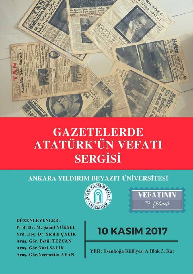 Gazi Mustafa Kemal Atatürk'ün vefatının 79. yılı dolayısıyla Üniversitemiz Külliyesinde İnsan ve Toplum Bilimleri Fakültesi Tarih Bölümü koordinatörlüğünde "Gazetelerde Atatürk'ün Vefatı" başlıklı bir sergi düzenlenecektir.