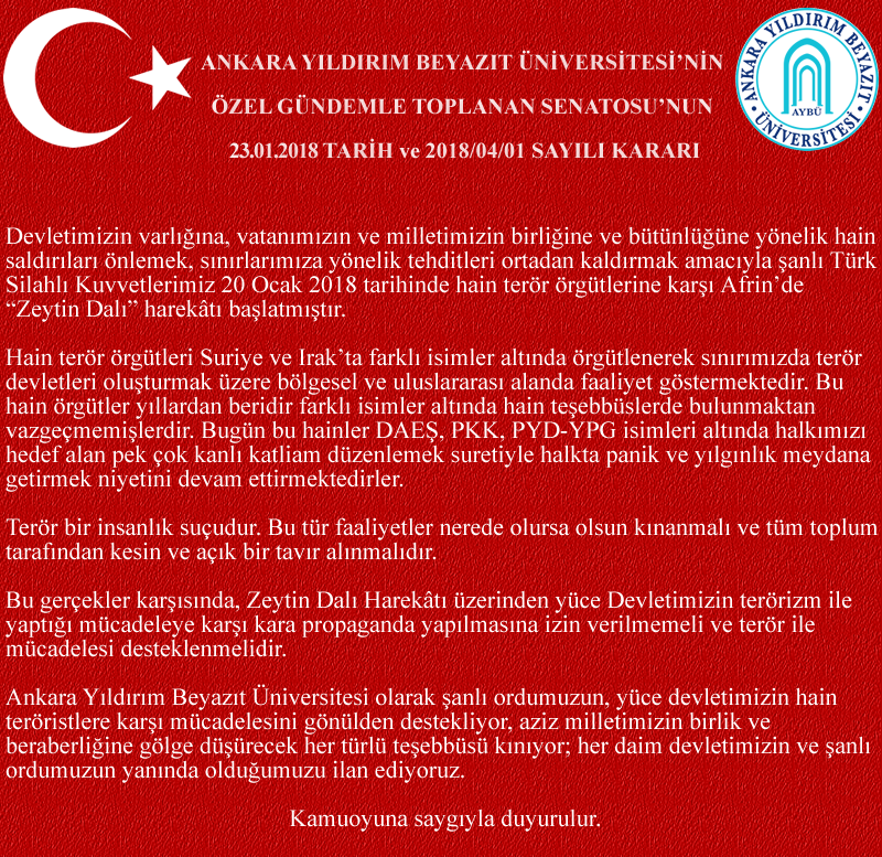 Üniversitemiz Senatosunun Afrin Harekatı Mesajı