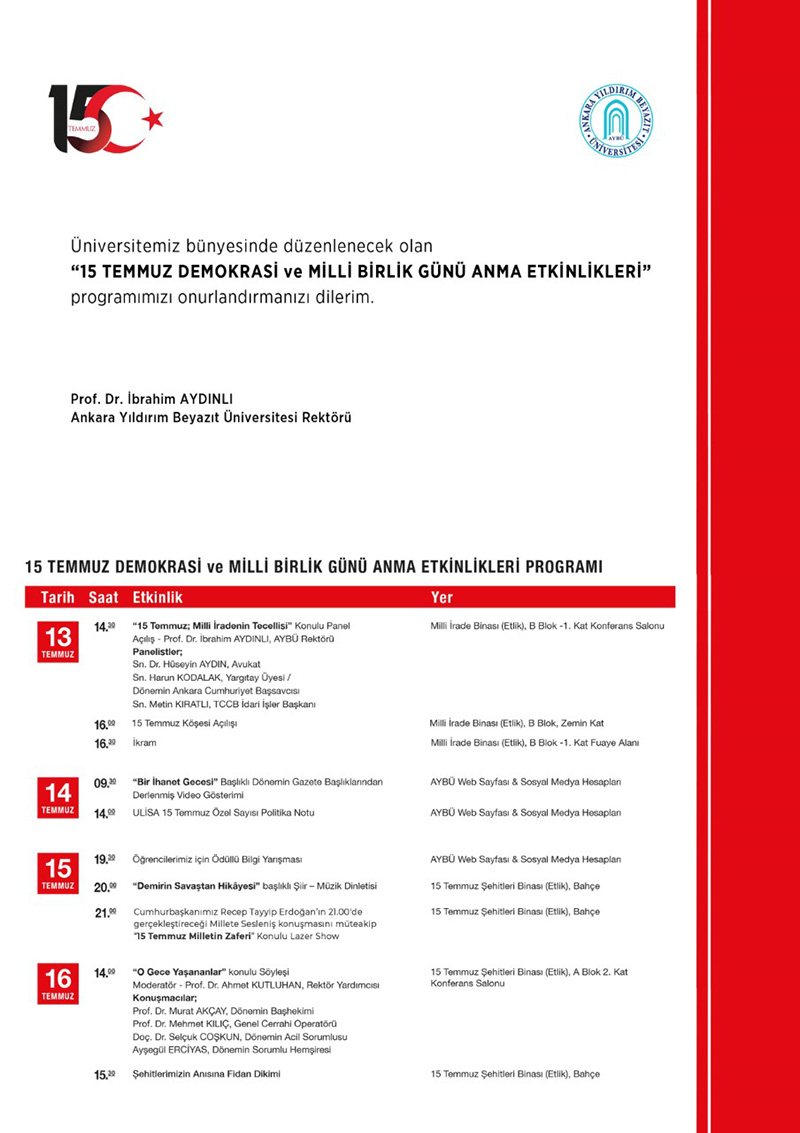 AYBÜ 15 Temmuz Demokrasi ve Milli Birlik Günü Anma Etkinlikleri Programı