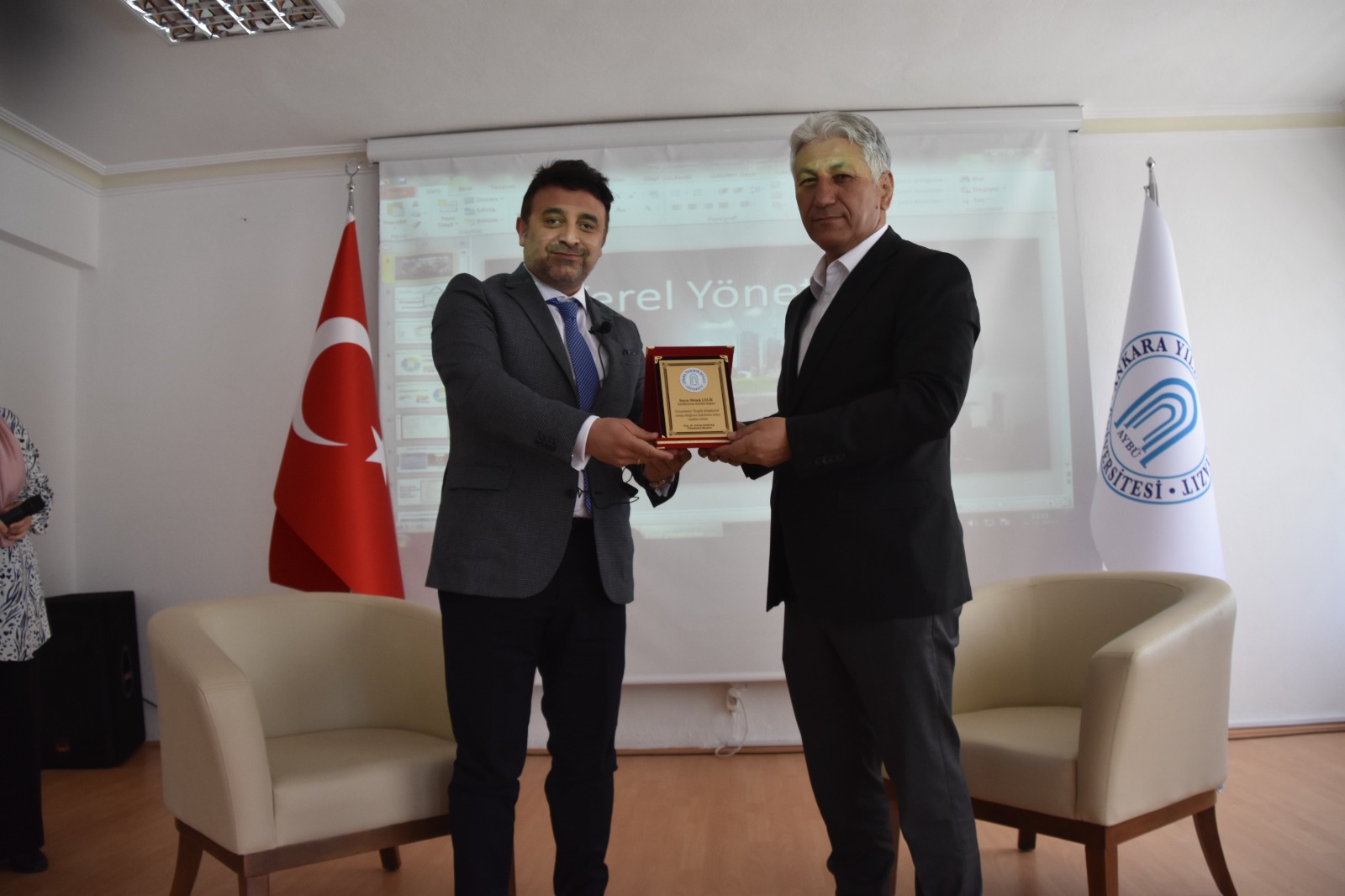 Fakülte Dekan Vekili ve Yüksekokul Müdürü Sayın Doç. Dr. Ahmet SARITAŞ moderatörlüğünde gerçekleştirilen söyleşi de açılış konuşmalarının ardından yerel yönetimler hakkında bilgilendirmelerde bulunan Sayın Memiş ÇELİK güncel gelişmelere yönelik paylaşımlarda bulundu. Kişisel gelişim ve kariyer planlama hakkında sohbet ortamında bilgi ve tecrübelerini öğrencilerimize aktararak ardından öğrencilerimizin sorularına yanıt verdi. Yerleşkemize katkılarından dolayı müdürümüz tarafından teşekkür edilerek plaket taktim edildi.