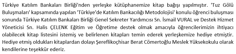 TÜRKİYE KATILIM BANKALARI BİRLİĞİ'NDEN YERLEŞKEMİZE KİTAP BAĞIŞI