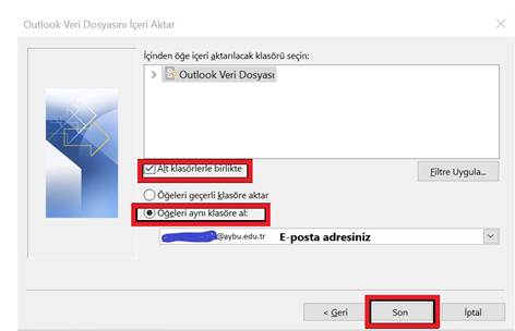 Aktarılacak öğeler ve posta kutusu seçilir ve Son butonuna tıklanır.