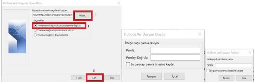 Gözat butonuna tıklanarak önceden kaydedilen “.pst” uzantılı Outlook Veri Dosyası seçilip İleri butonuna tıklanır. Dosya şifreli ise şifre girildikten sonra Tamam butonuna tıklanır.