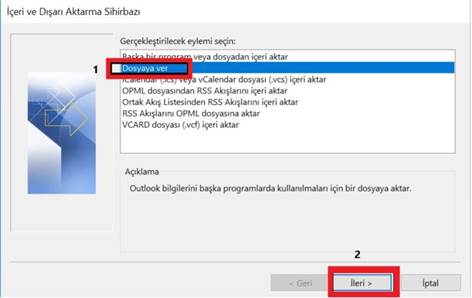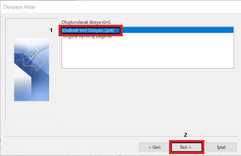 Outlook Veri Dosyası (.pst) Seçeneği işaretlenir ve İleri butonuna tıklanır.
