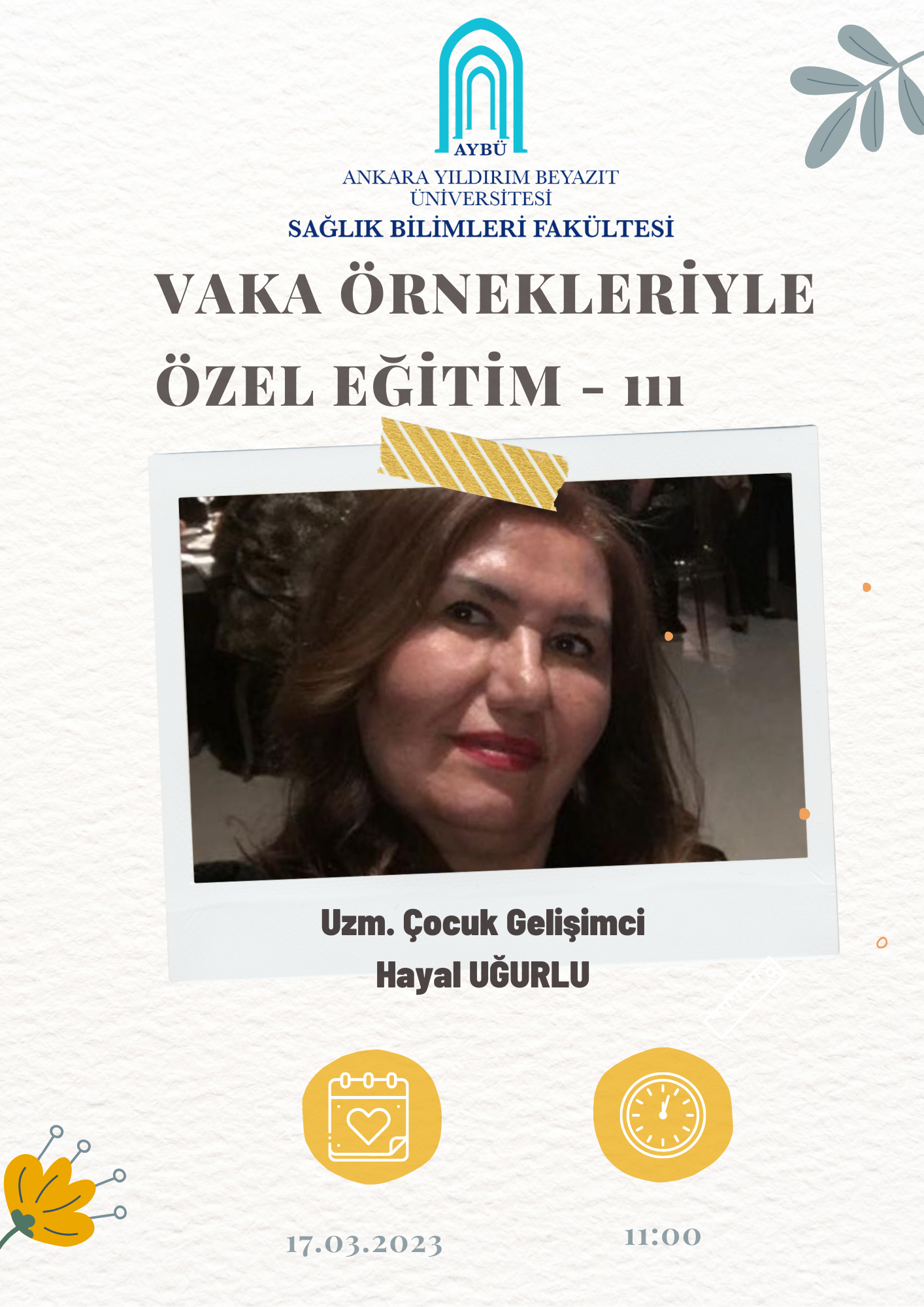 Bölümümüz Özel Eğitim Uygulaması II dersi kapsamında 4. sınıf öğrencilerinin mesleki yeterliklerini geliştirmek amacı ile düzenlenen "Vaka Örnekleriyle Özel Eğitim Uygulamaları" sunumlarının üçüncüsü bu hafta Özel Uğurlu Özel Eğitim Okulu'ndan çocuk gelişimi uzmanı Hayal UĞURLU'nun katılımı ile saat 13:00'da gerçekleştirilecektir.