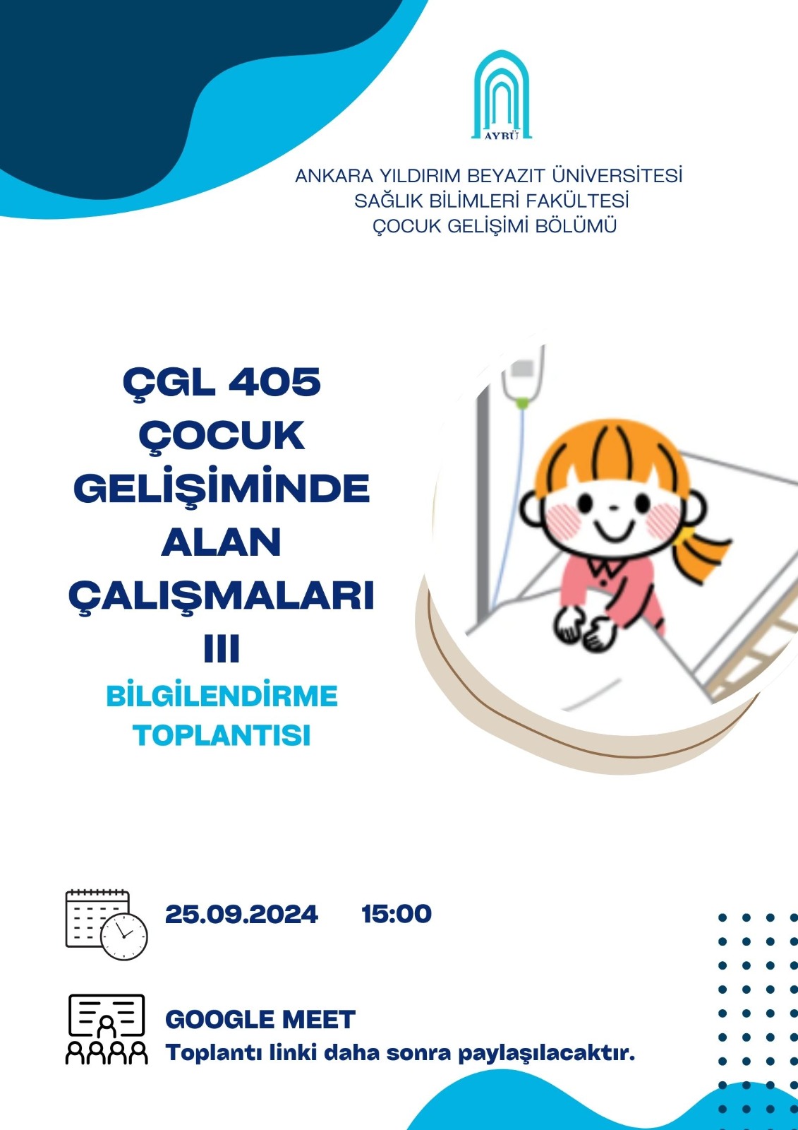 "ÇGL405 Çocuk Gelişiminde Alan Çalışmaları III Bilgilendirme Toplantısı" 25.09.2024 tarihinde gerçekleştirilecektir.