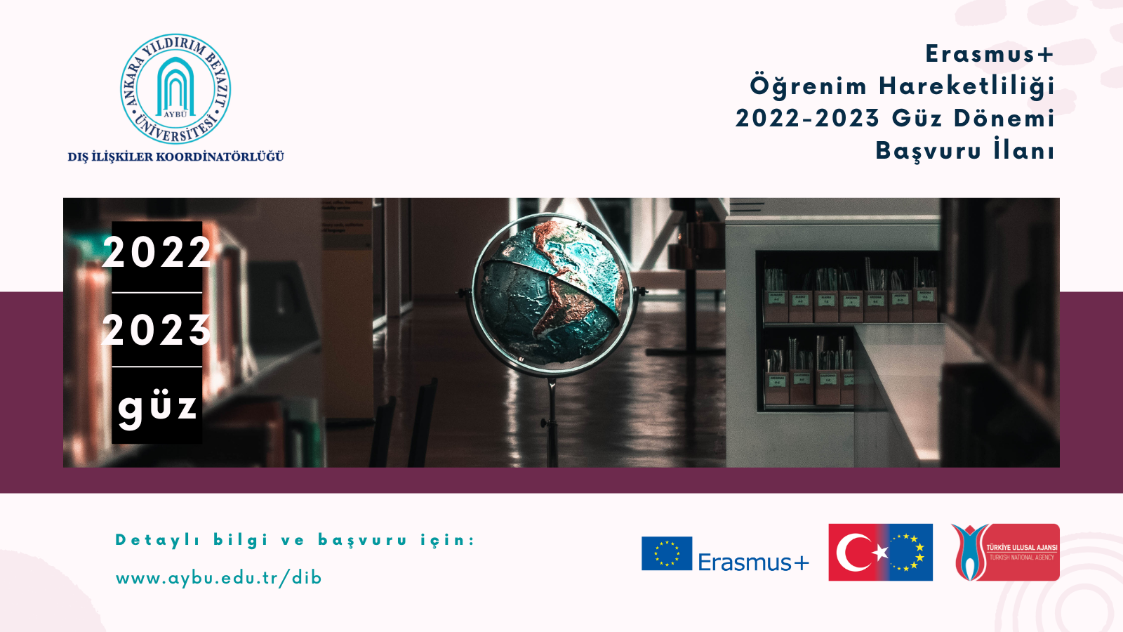 Erasmus+ Öğrenim Hareketliliği 2022-2023 Güz Dönemi başvuru ilanımız yayımlanmış olup başvuru ilanı ve detaylarına aşağıdaki bağlantıdan ulaşabilirsiniz.