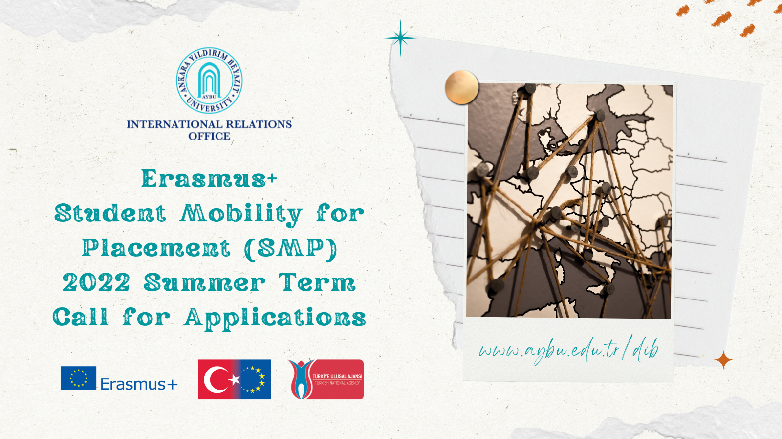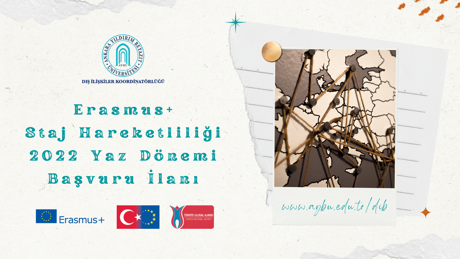 * GÜNCELLEME: AYBÜ Erasmus+ Komitesi tarafından, Erasmus+ Staj Hareketliliği Başvuru İlanı son başvuru tarihlerinde değişikliğe gidilmiş olup öğrencilerimiz 25.04.2022, Saat:23.59'a kadar online başvurularını gerçekleştirebilir.