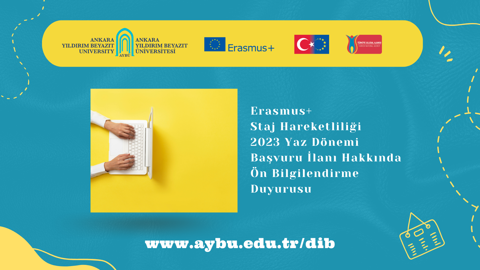 “Erasmus+ Staj Hareketliliği 2023 Yaz Dönemi Başvuru İlanı”na ilişkin başvuru takvimi, başvuru süreci vb. tüm detaylar web sayfamızda, Nisan ayının ilk haftasında yayımlanacaktır. İlgili ilana başvuru yapmak isteyen öğrencilerimizin https://bit.ly/41Y8VWW adresindeki “Erasmus+ 2023-2024 Güz Dönemi Öğrenim Hareketliliği ve Erasmus+ 2023 Yaz Dönemi Staj Hareketliliği Başvuru İlanlarına Yönelik AYBÜ 2023 Erasmus+ Çevrimiçi Dil Sınavı Duyurusu”nu okuyarak çevrimiçi dil sınavına başvuru yapmaları ve ilgili sınavdan gerekli olan asgari 70 puanı almaları gerekmektedir.