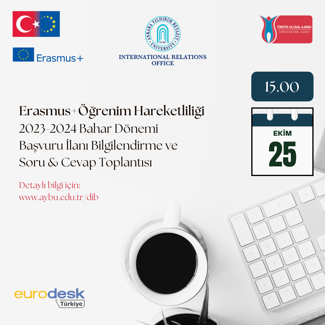 AYBÜ Erasmus+ Öğrenim Hareketliliği 2023-2024 Bahar Dönemi başvuru ilanına yönelik bilgilendirme ve soru-cevap toplantısı düzenlenecektir. Bu toplantı 25 Ekim 2023 Çarşamba günü saat 15.00’te Microsoft Teams üzerinden çevrimiçi olarak gerçekleştirilecektir.