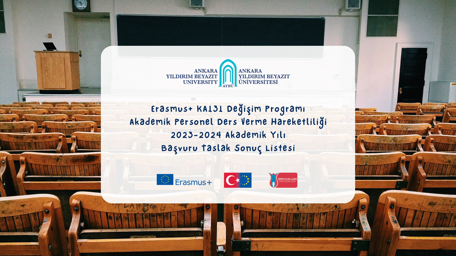 AYBÜ 2023-2024 akademik yılı Erasmus+ Personel Ders Verme Hareketliliği İlanı başvuru sonuçları değerlendirilme süreci tamamlanmış olup taslak sonuçlara ilişkin listeye aşağıdaki bağlantıdan erişilebilmektedir. Bu liste henüz taslak niteliğinde olup nihai sonuç listesi itiraz süreci tamamlandığında yayımlanacaktır.