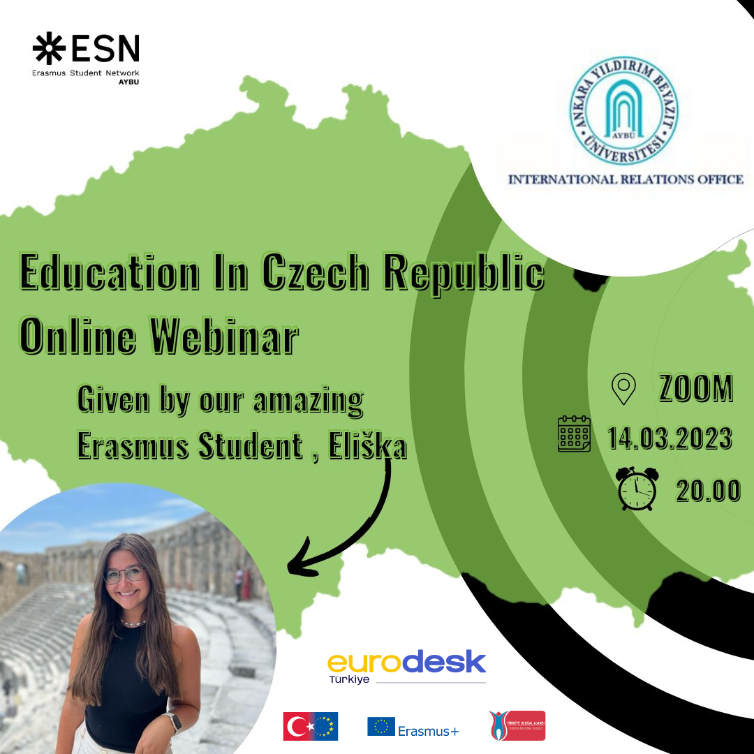 Erasmus+ anlaşmalı üniversitelerimizden, University of South Bohemia'dan bu dönem üniversitemize gelerek Erasmus+ stajyer öğrenci olarak ofisimizin çalışmalarına katkı sunan Eliŝka'nın Çekya ve Erasmus+'a dair paylaşımlarda bulunacağı bir çevrim içi etkinlik düzenlenecektir.