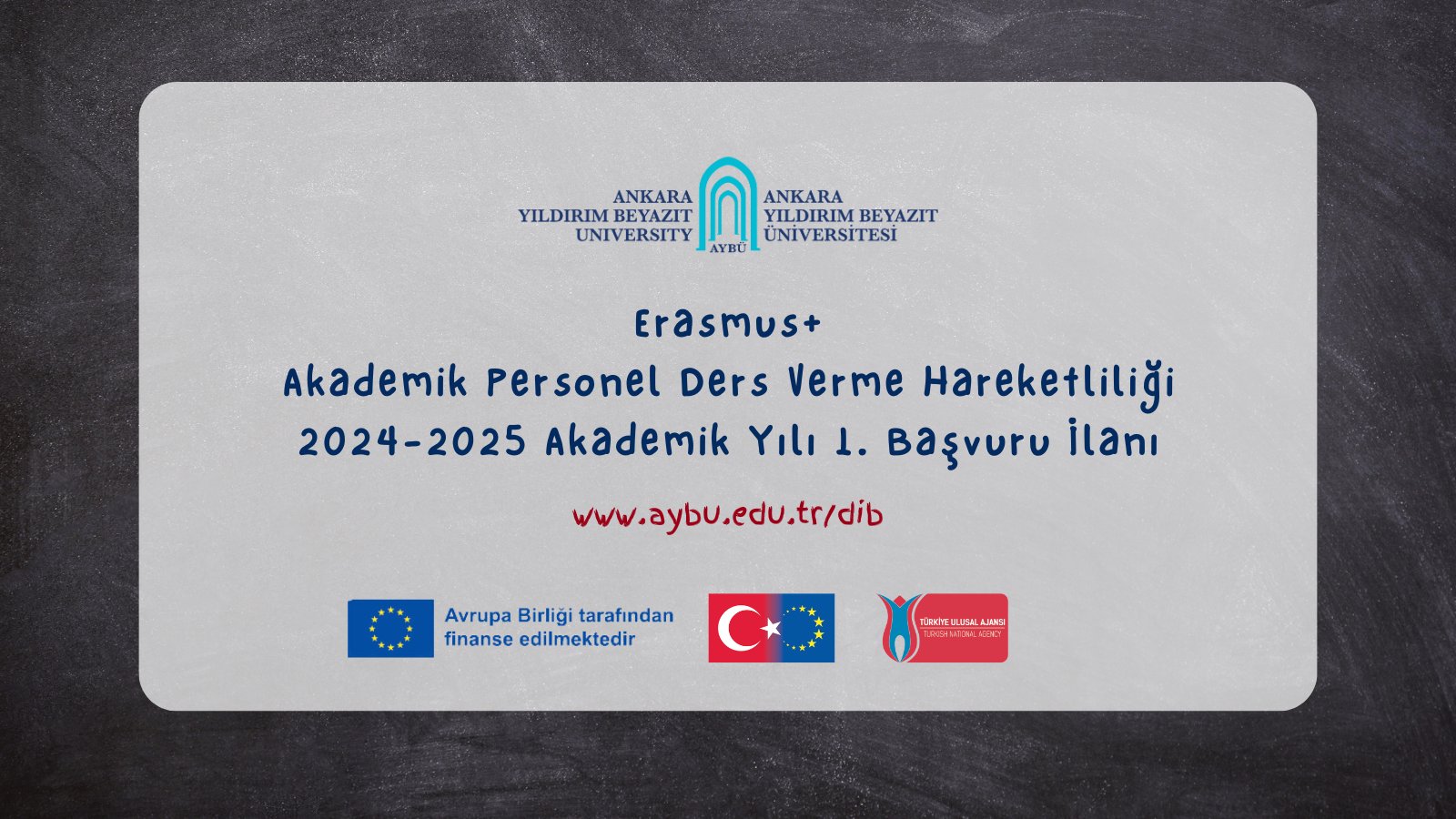 AYBÜ 2024-2025 akademik yılı Erasmus+ Personel Ders Verme Hareketliliği I. İlanı başvuru süreci Türkiye Ulusal Ajansı tarafından yönetilen Erasmus Başvuru Portalı üzerinden tamamen çevrim içi olarak yürütülecektir.