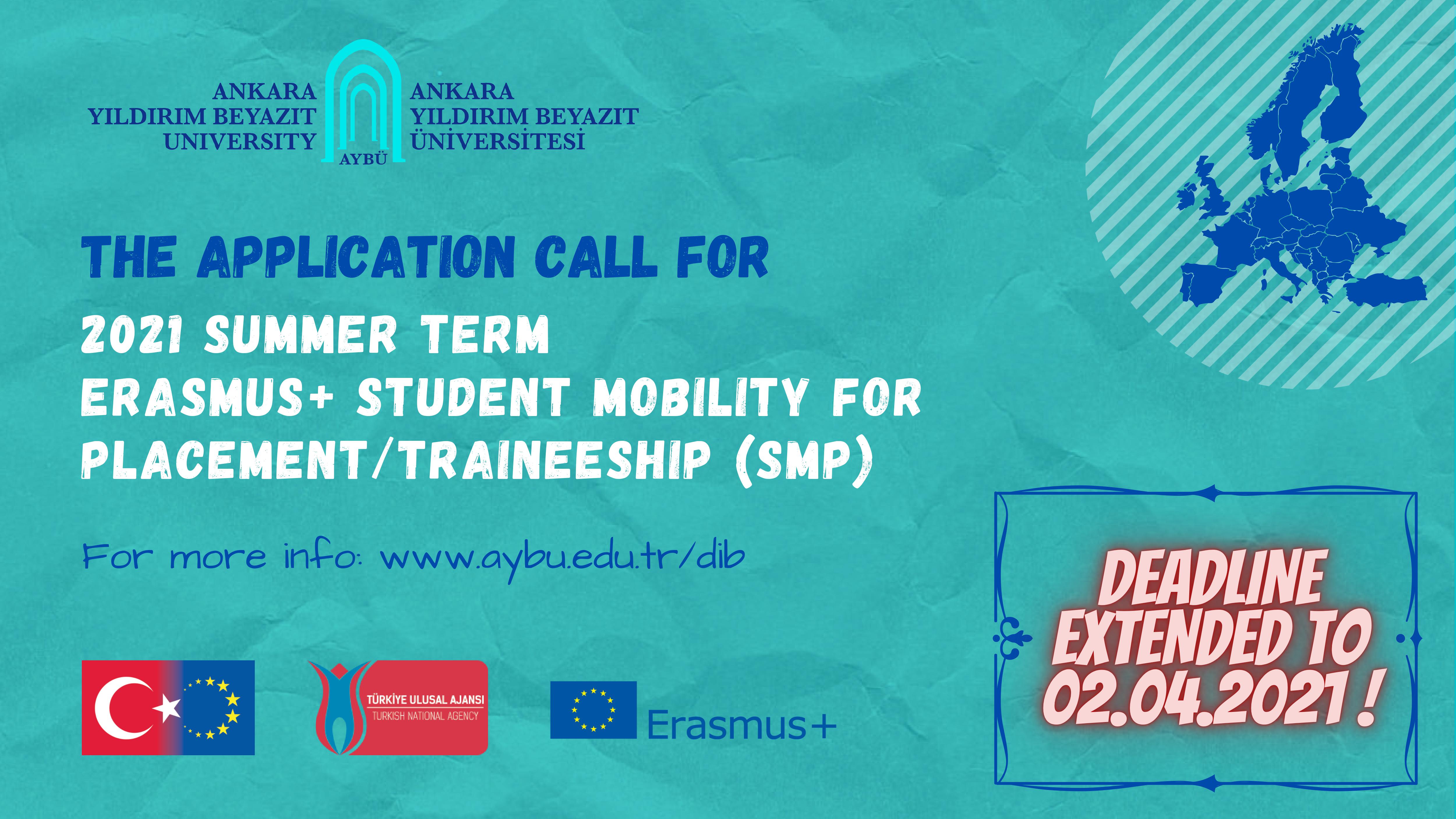 Erasmus+ Staj Hareketliliği ilanımız için 26.03.2021 olan son başvuru tarihi AYBÜ Erasmus Komitesi tarafından uzatılmış olup 02.04.2021 tarihi, saat:23.59'a dek Erasmus+ Staj Hareketliliği başvurunuzu online olarak gerçekleştirebilirsiniz.