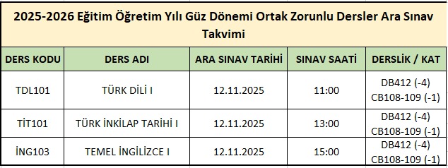 (2025 - 2026 Eğitim Öğretim Yılı Güz Dönemi ) Ortak zorunlu Dersler Ara Sınav Takvimi