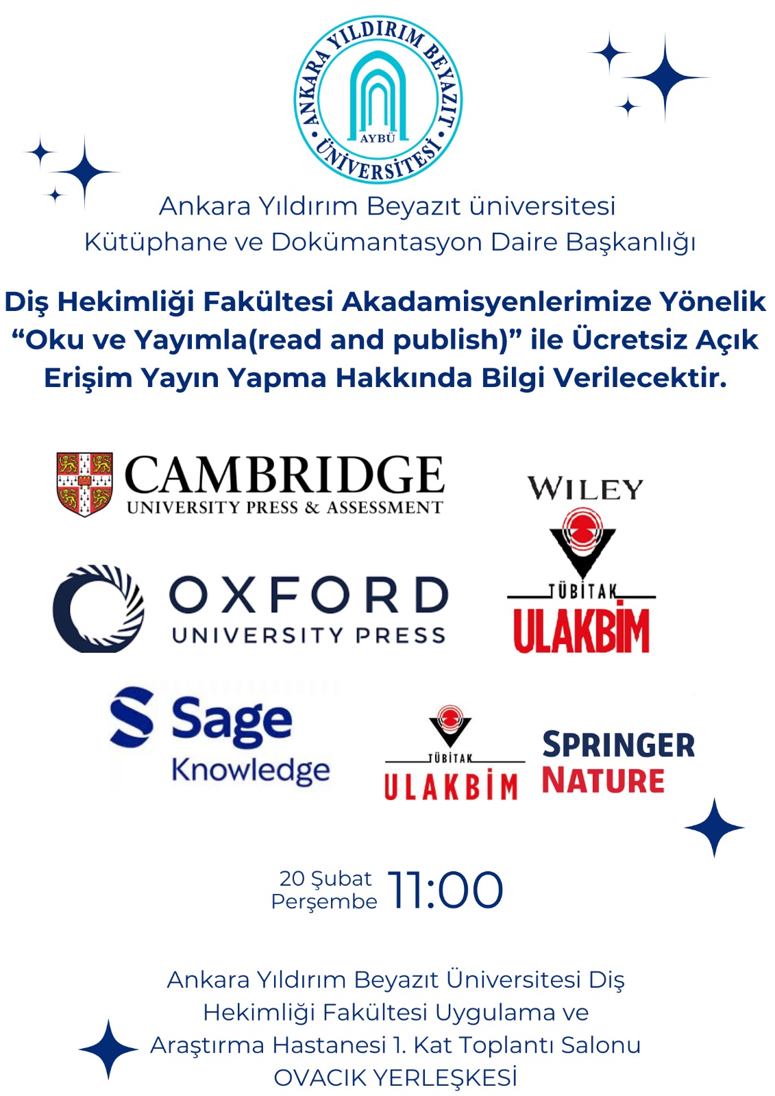 Diş Hekimliği Fakültesi Akademisyenlerimize Yönelik "Oku ve Yayımla (read and publish)" ile Ücretsiz Açık Erişim Yayın Yapma Hakkında Bilgi Toplantısı 20.02.2025 tarihinde saat 11:00'da Ovacık Yerleşkesi 1. kat Toplantı Salonunda Yapılacaktır.