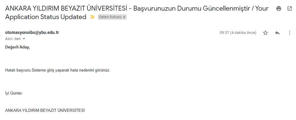 Online başvuru sistemimizde, başvurunuza dair yapılan herhangi bir değerlendirme yapıldığında mail adresiniz aracılığıyla bilgilendirilmektesiniz.