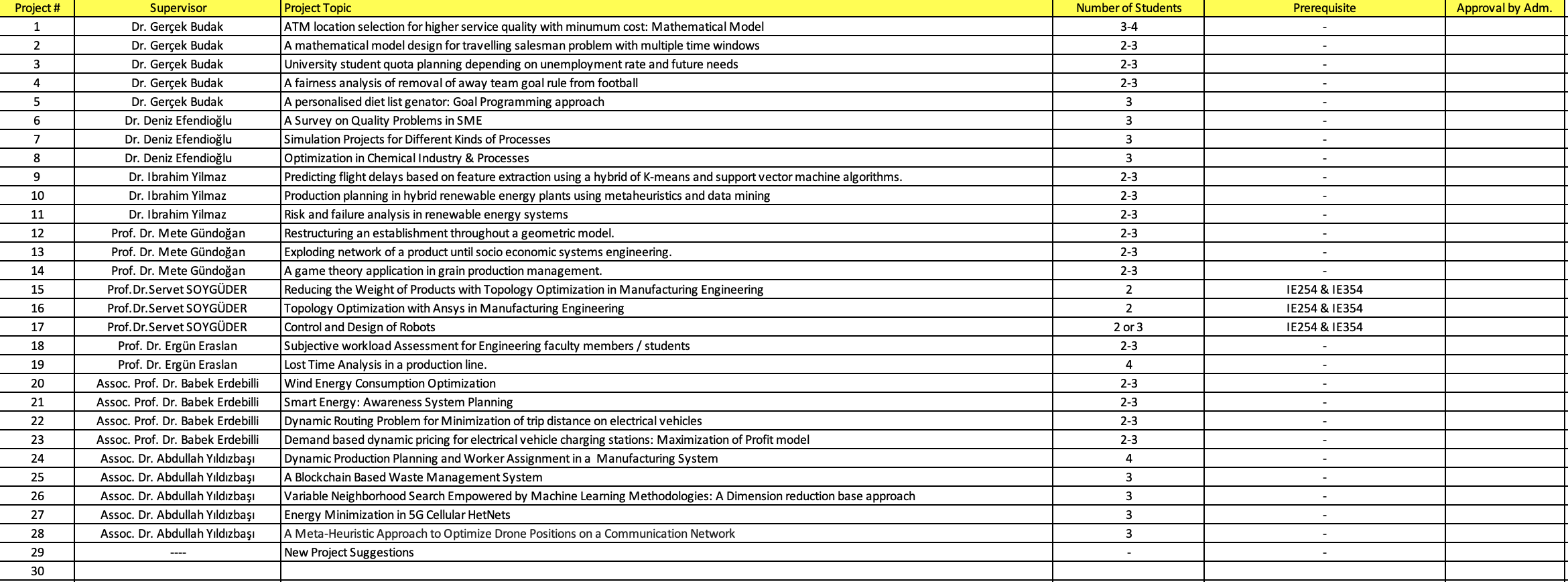In the attached file, possible graduation projects determined by our academic staff and their required qualifications are announced. Projects have conditions for the number of people to be included in the group, project names, and required letter grades. You need to create your groups in accordance with the desired number of people and apply them to the Professor of the project. With the approval of the project teacher, the timeline of your graduation project will be determined by your advisor after it is submitted for the approval of the department chair and accepted. Students are kindly requested not to apply to more than one project at the same time. It will be run on a first-come, first-served basis. Apart from the proposed graduation projects, the student groups that have a project idea can be sent to the advisors of their own choice or to Dr. They must apply to the True Budak.