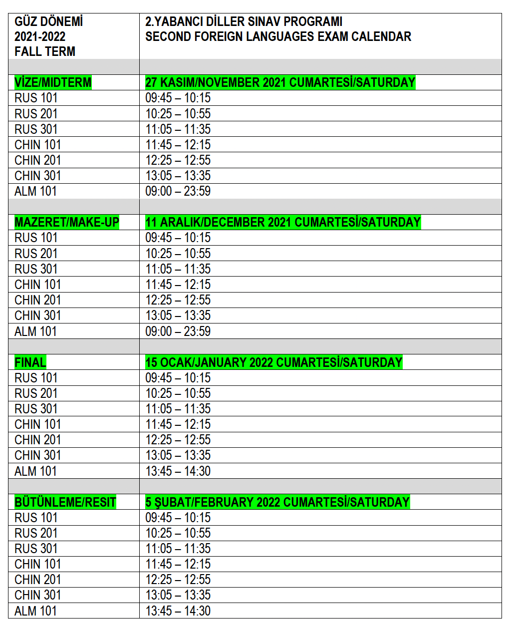 2021-2022 FALL SECOND FOREIGN LANGUAGES EXAM CALENDAR