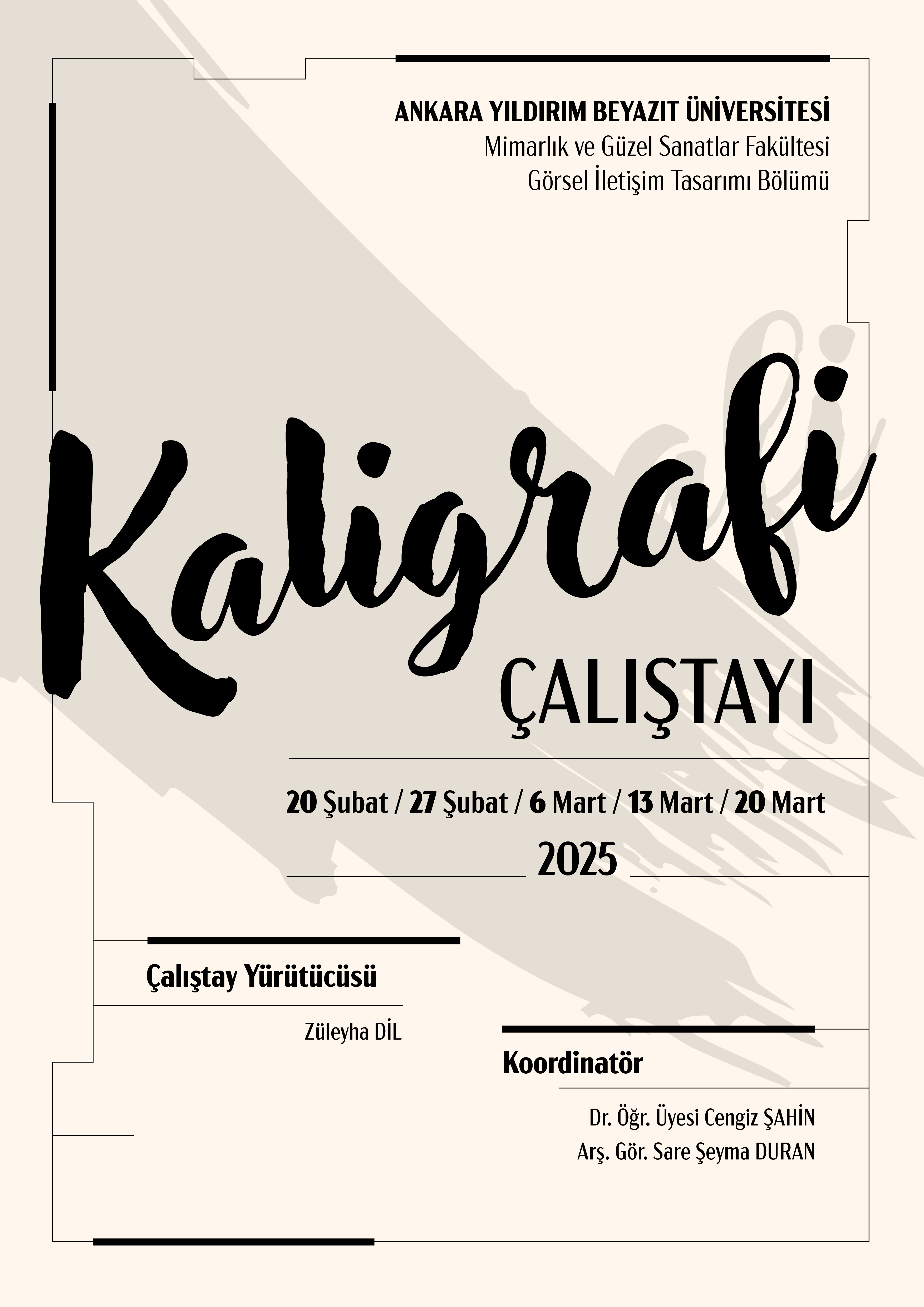 Bölümümüz tarafından 20 Şubat - 27 Şubat - 6 Mart - 13 Mart - 20 Mart tarihlerinde Züleyha Dil'in yürütücülüğünde "Kaligrafi Çalıştayı" gerçekleştirilecektir.