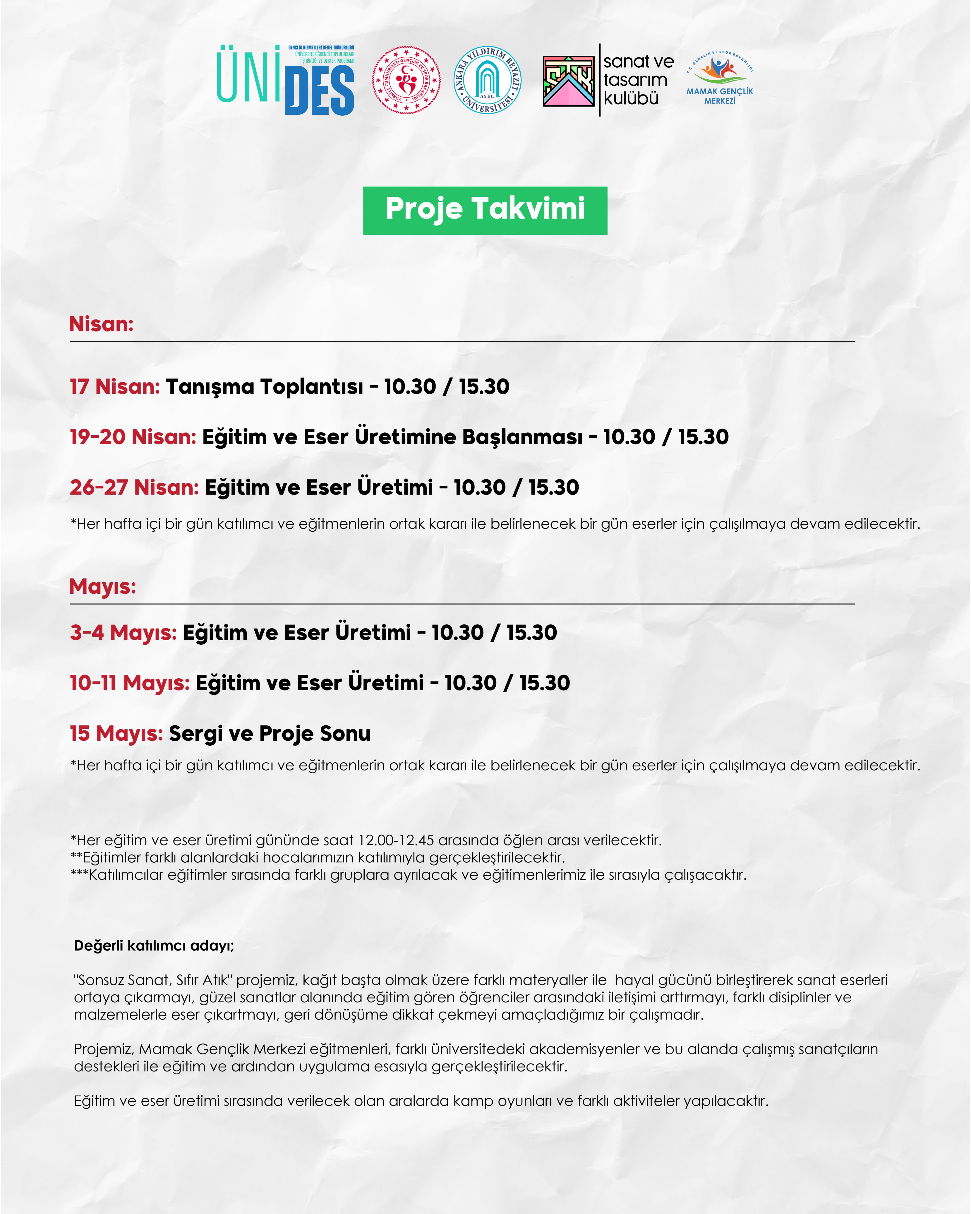 - Proje 4 hafta eserler üzerine çalışma ve 5. hafta eserlerin sergisi şeklinde planlanmaktadır.,