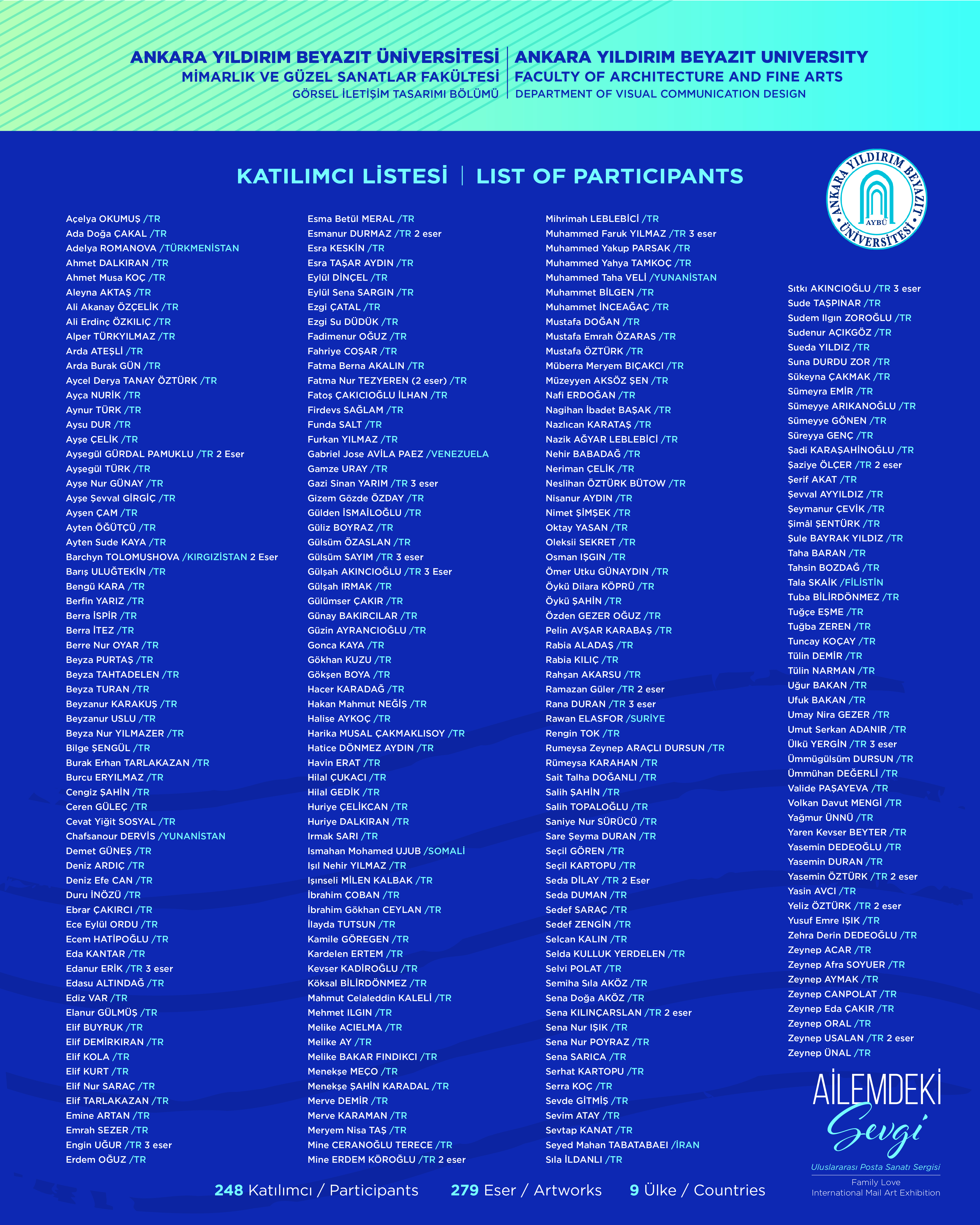 Ankara Yıldırım Beyazıt Üniversitesi Mimarlık ve Güzel Sanatlar Fakültesi Görsel İletişim Tasarımı Bölümü olarak 25 Kasım-16 Aralık 2024 tarihinde “Ailemdeki Sevgi” temalı uluslararası posta sanatı sergisi gerçekleştirilmiştir. Katılımınız için teşekkür ederiz.