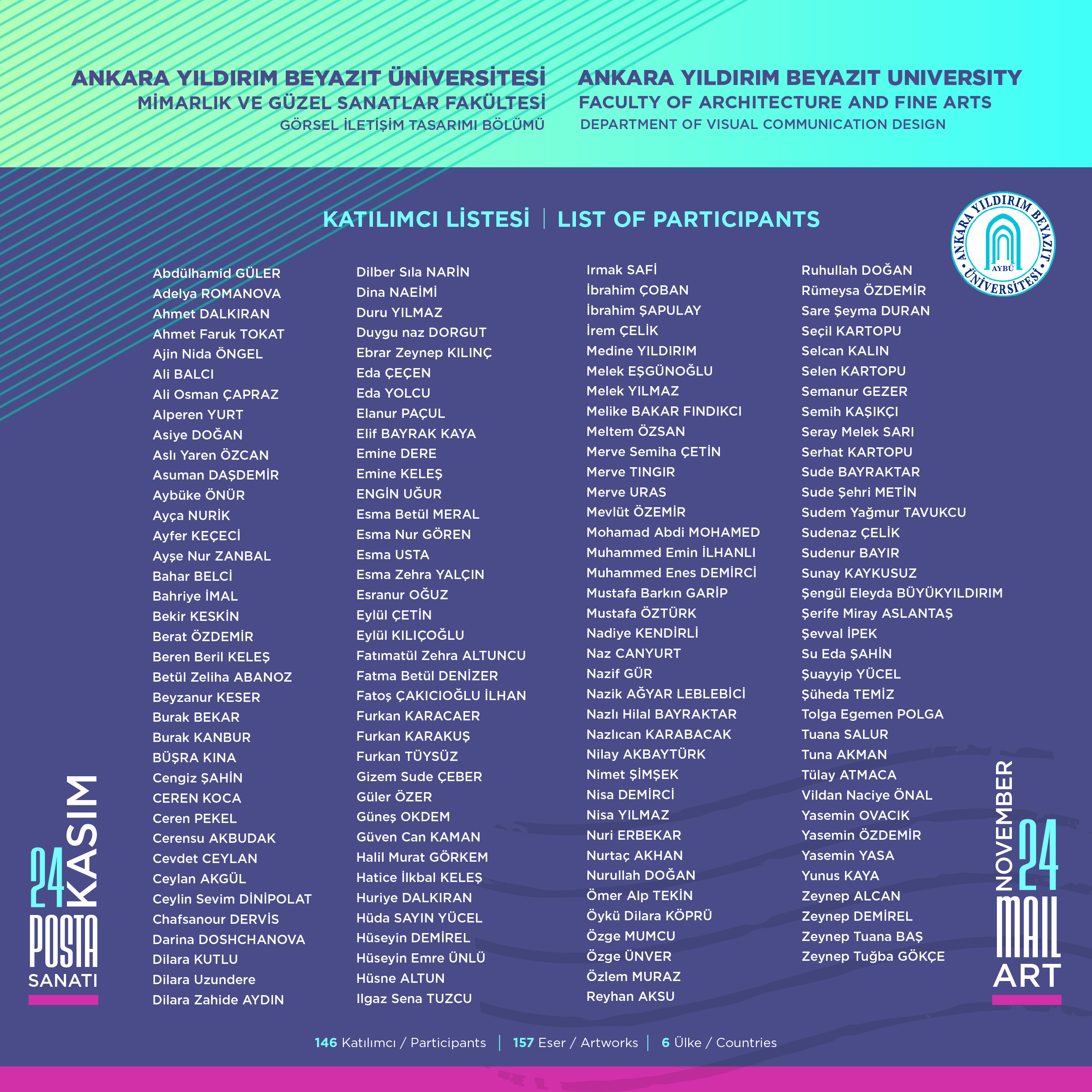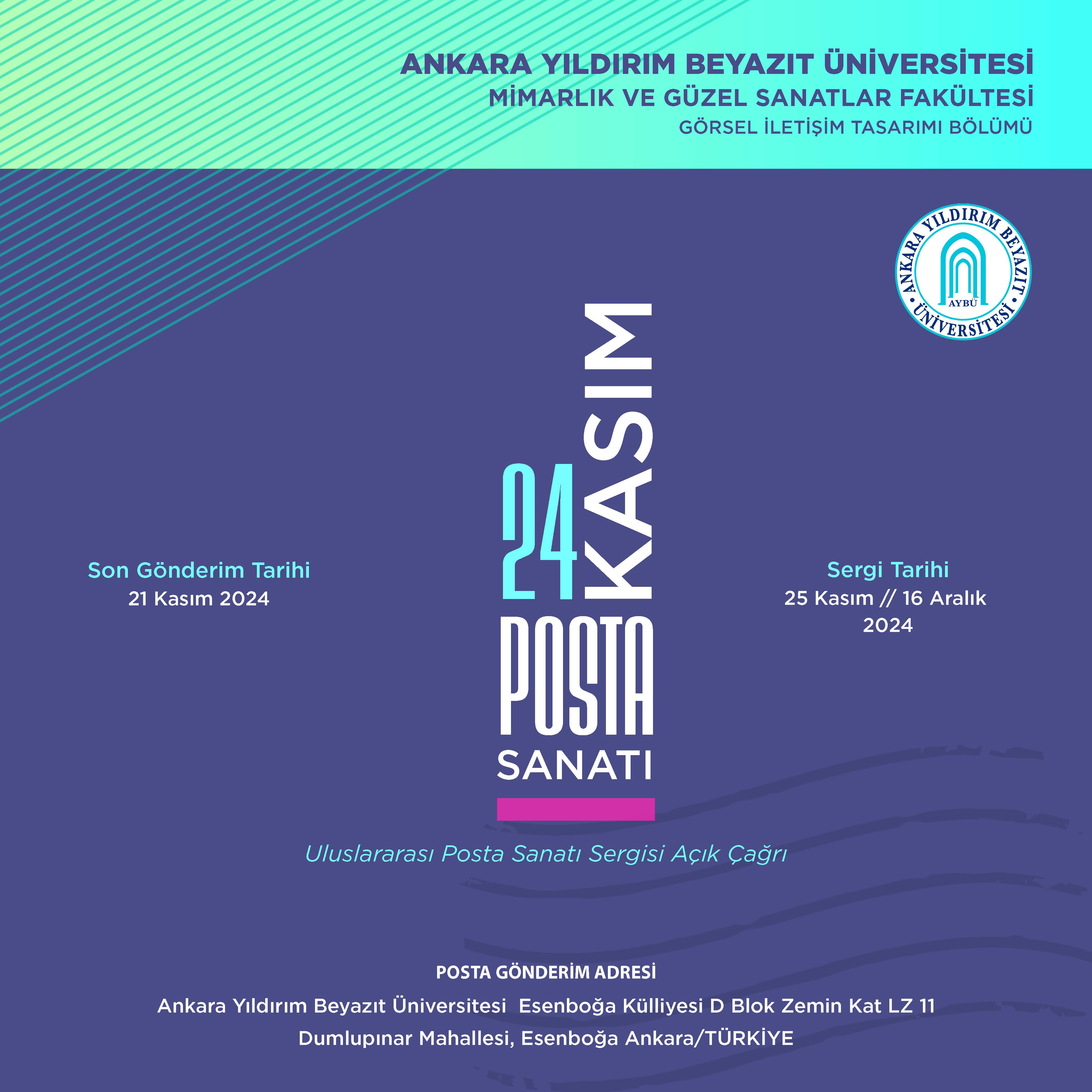 Ankara Yıldırım Beyazıt Üniversitesi Mimarlık ve Güzel Sanatlar Fakültesi Görsel İletişim Tasarımı Bölümü olarak 25 Kasım-16 Aralık 2024 tarihinde 24 Kasım Öğretmenler Gününü kutlamak amacıyla gerçekleştirdiğimiz “24 Kasım Posta Sanatı” sergisine katıldığınız için teşekkür ederiz.
