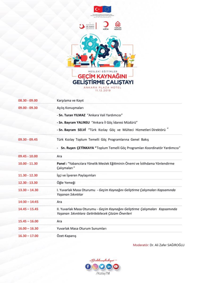 Merkez Müdürümüz Sn. Dr. Ali Zafer SAĞIROĞLU'nun moderatörlüğünde, Ankara Valiliği İl Göç İdaresi Müdürlüğü ve Türk Kızılay Ankara Toplum Merkezi işbirliği ile 11 Aralık 2019 tarihinde “Geçim Kaynağını Geliştirme Çalıştayı” gerçekleştirilmiştir. Ankara Vali Yardımcısı Sn. Turan YILMAZ, Ankara İl Göç İdaresi Müdürü Sn. Bayram Yalınsu ve Türk Kızılay Göç Hizmetleri Direktörü Sn. Bayram Selvi’nin açılış konuşmaları ile başlayan etkinlik panel ve yuvarlak masa görüşmeleriyle devam etmiştir. Yapılan görüşmelerden elde edilen sonuçların paylaşıldığı bir sunum ile program sona ermiştir.