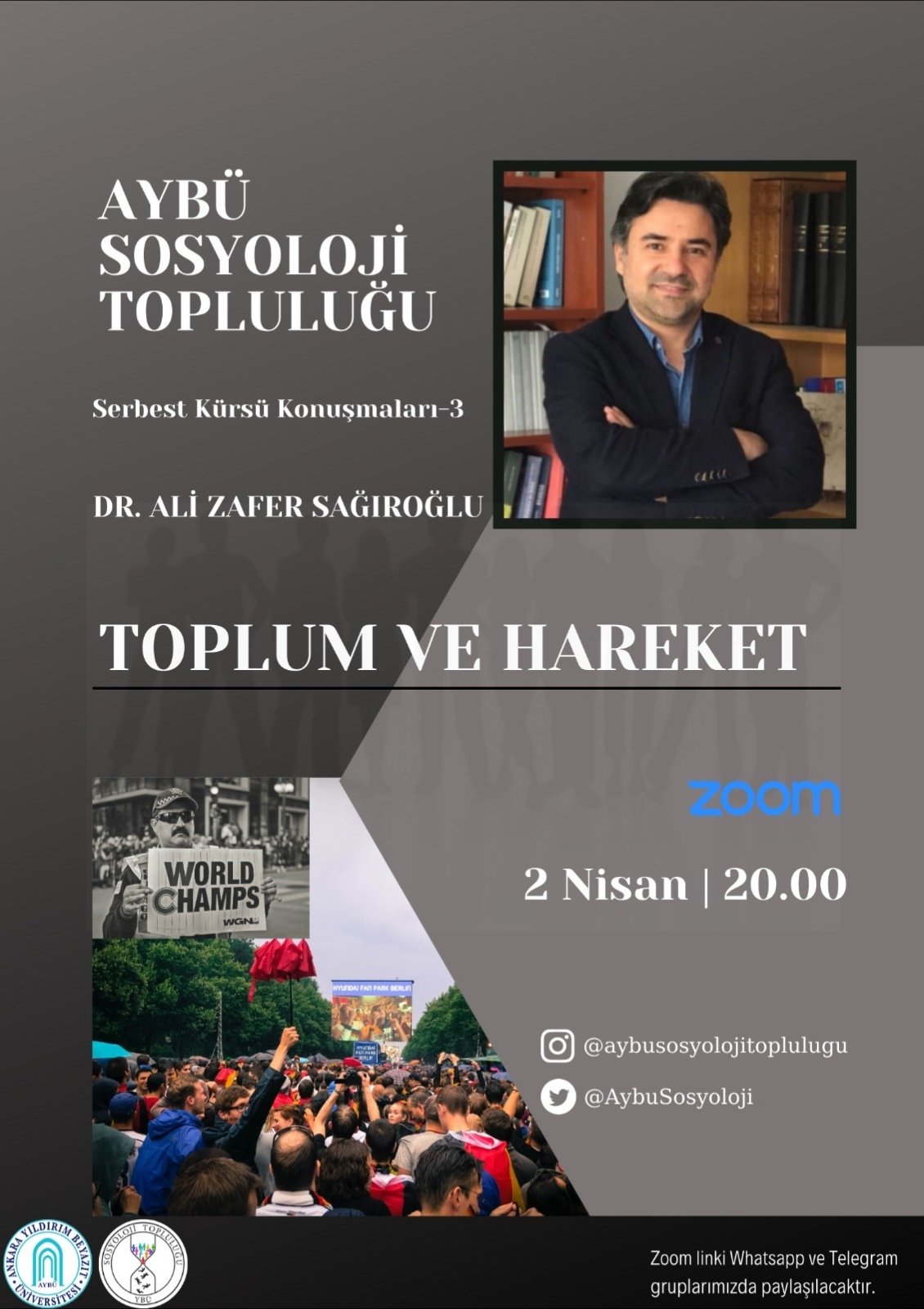 Merkez Müdürümüzü Sayın Dr. Öğr. Üyesi Ali Zafer Sağıroğlu, 02 Nisan 2021 tarihinde Ankara Yıldırım Beyazıt Üniversitesi Sosyoloji Topluluğu tarafından düzenlenen "Serbest Kürsü Konuşmaları" kapsamında "Toplum ve Hareketlilik" başlıklı bir konferans vermiştir.
