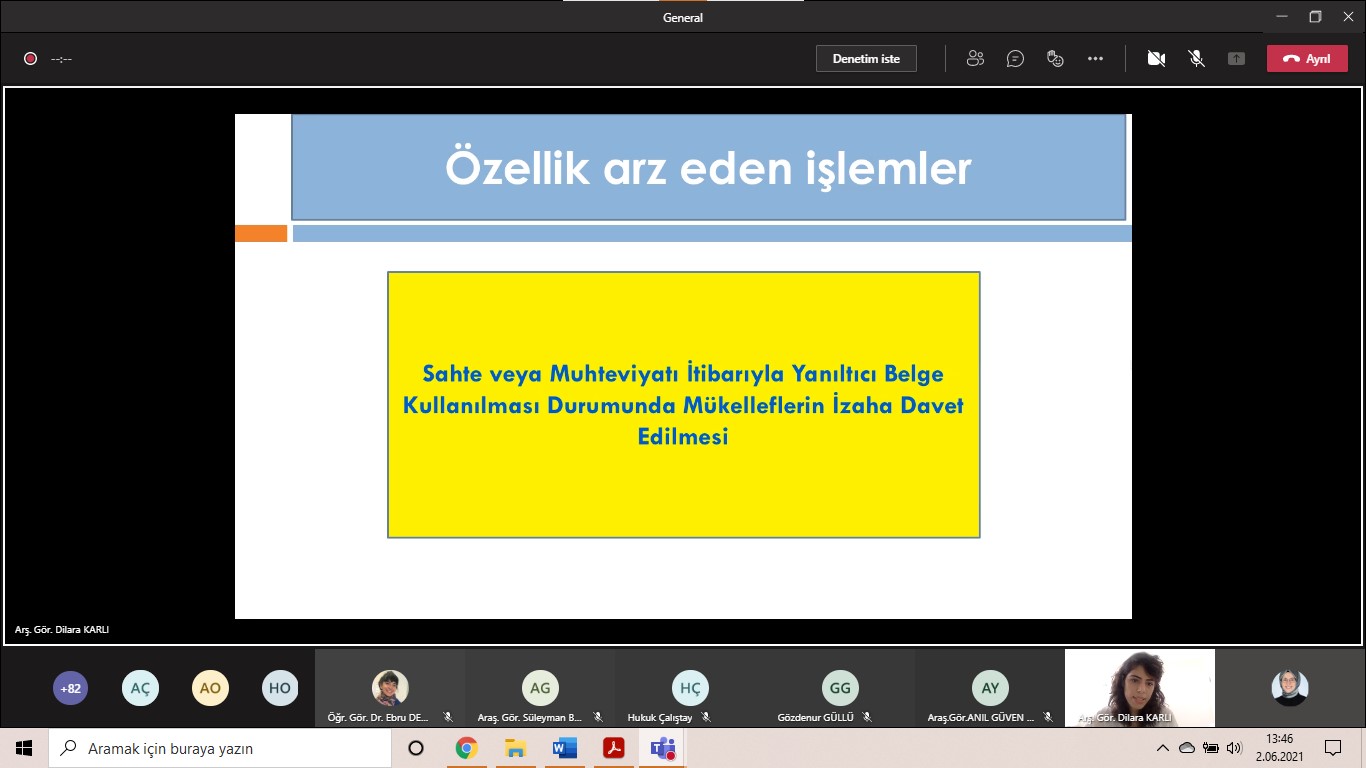 Res. Assist Dilara Karlı first gave information about the origins of invitation to clarify. Then, she explained the conditions of invitation to clarify and responsible institutions. Following, Res. Assist. Dilara Karlı analysed preliminary determination and special procedures in invitation to clarify. After the informative presentation of Res. Assist Dilara Karlı, the question and answer section started, and the program ended.