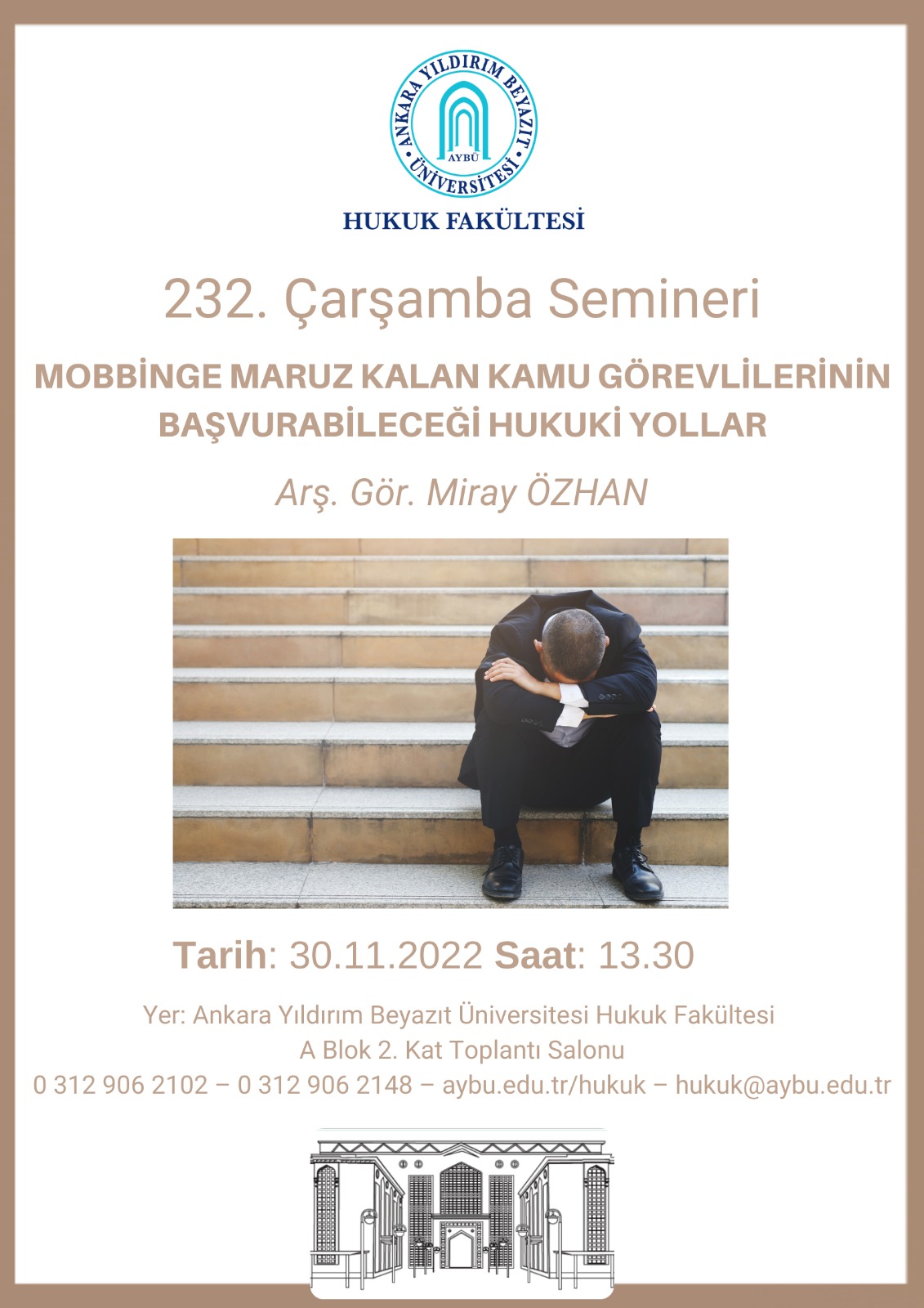 232. Çarşamba Semineri İdare Hukuku Anabilim Dalı Arş. Gör. Miray ÖZHAN tarafından "Mobbinge Maruz Kalan Kamu Görevlilerinin Başvurabileceği Hukuki Yollar" konusunda gerçekleştirilecektir. Sunum kapsamında öncelikle mobbing (işyerinde psikolojik taciz)  kavramı ve kavramın unsurlarından bahsedilecektir. Ardından mevzuat ve yargı kararları ışığında mobbingin kamudaki özel görünümleri aktarılacaktır. Son olarak mobbinge maruz kalan kamu görevlilerinin izleyebileceği idari ve yargısal başvuru yolları incelenerek  söz konusu hukuki yolların etkililiği değerlendirilecektir.
