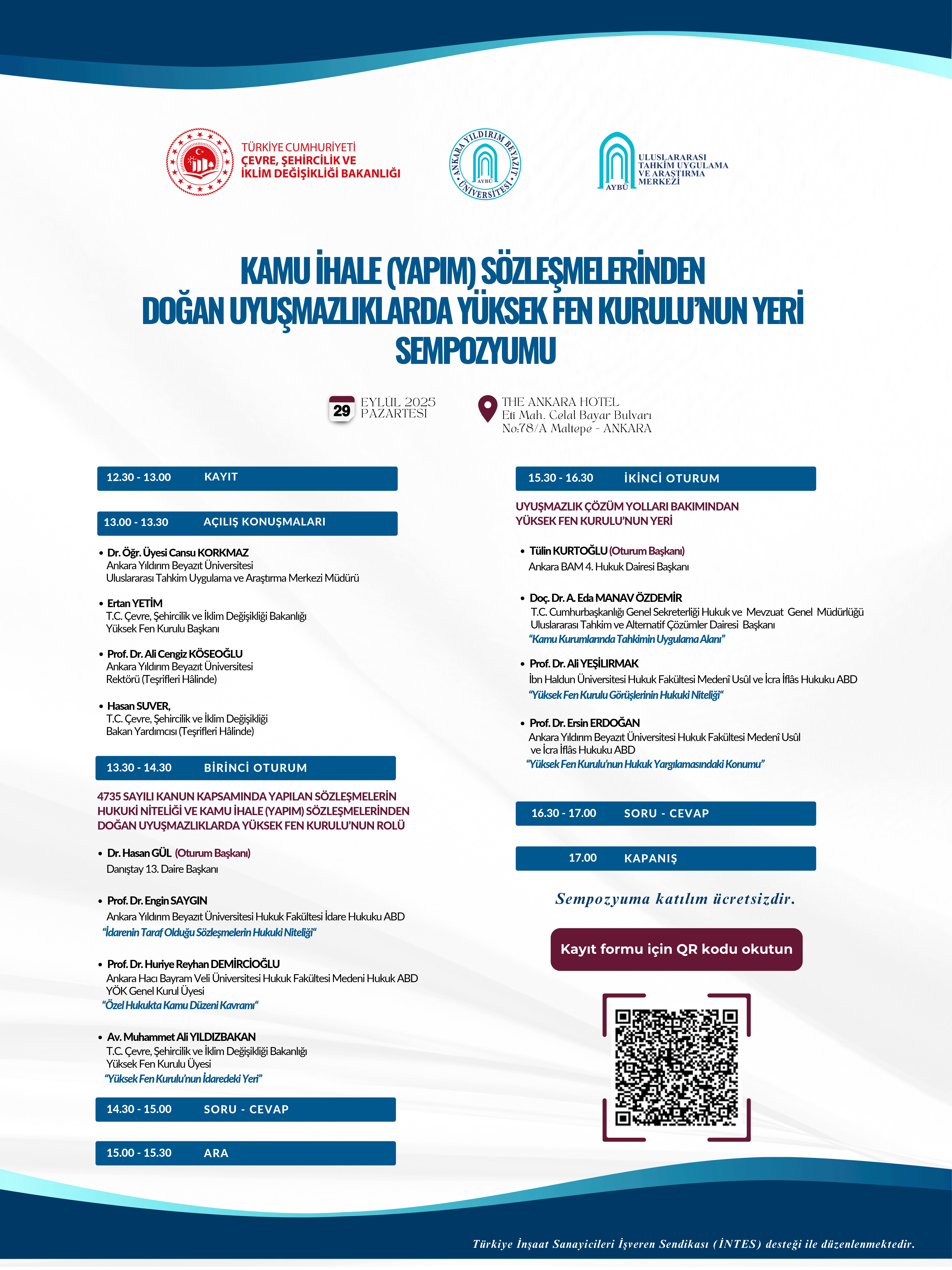 Üniversitemiz Uluslararası Tahkim Uygulama ve Araştırma Merkezi ve T.C. Çevre Şehircilik ve İklim Değişikliği Bakanlığı (Yüksek Fen Kurulu Başkanlığı) işbirliği ile “Kamu İhale (Yapım) Sözleşmelerinden Doğan Uyuşmazlıklarda Yüksek Fen Kurulu’nun Yeri Sempozyumu” gerçekleştirilecektir.