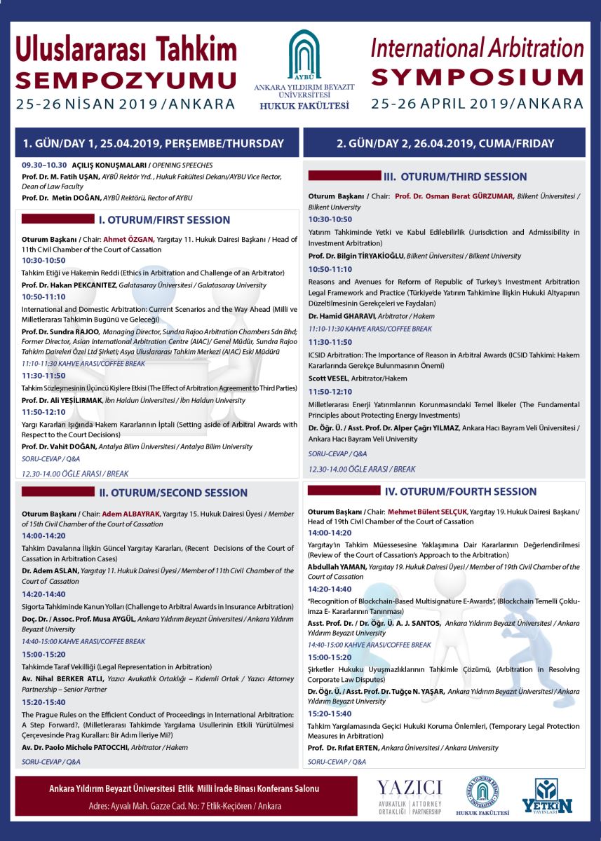 25-26 Nisan 2019 tarihlerinde Ankara Yıldırım Beyazıt Üniversitesi Hukuk Fakültesi tarafından “Uluslararası Tahkim” başlıklı uluslararası bir konferans düzenlenecektir.