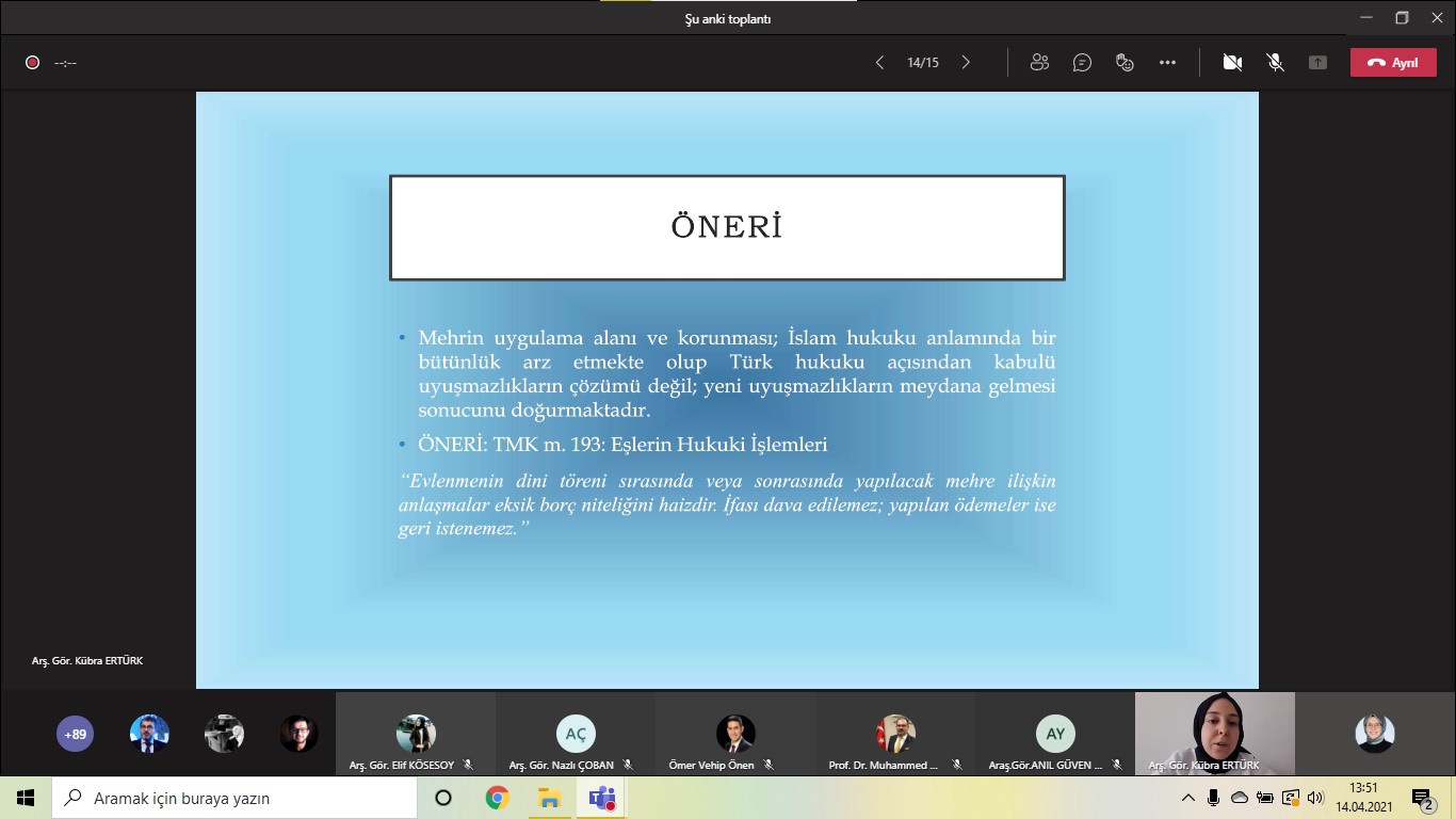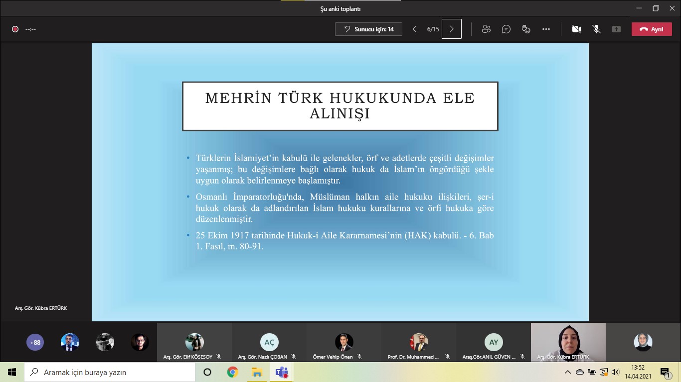 Arş. Gör. Kübra ERTÜRKsunumunda öncelikle mehir kurumu hakkında bilgi vermiştir. Akabinde, Mehrin Türk hukukunda ele alınışı açıklandı. Arş. Gör. Kübra ERTÜRK, sunumunun devamında Yargıtay'ın mehrin hukuki niteliği hakkındaki görüşünü ele alarak değerlendirmiş ve  son olarak konu ile ilgili önerisi hakkında bilgi vermiştir.