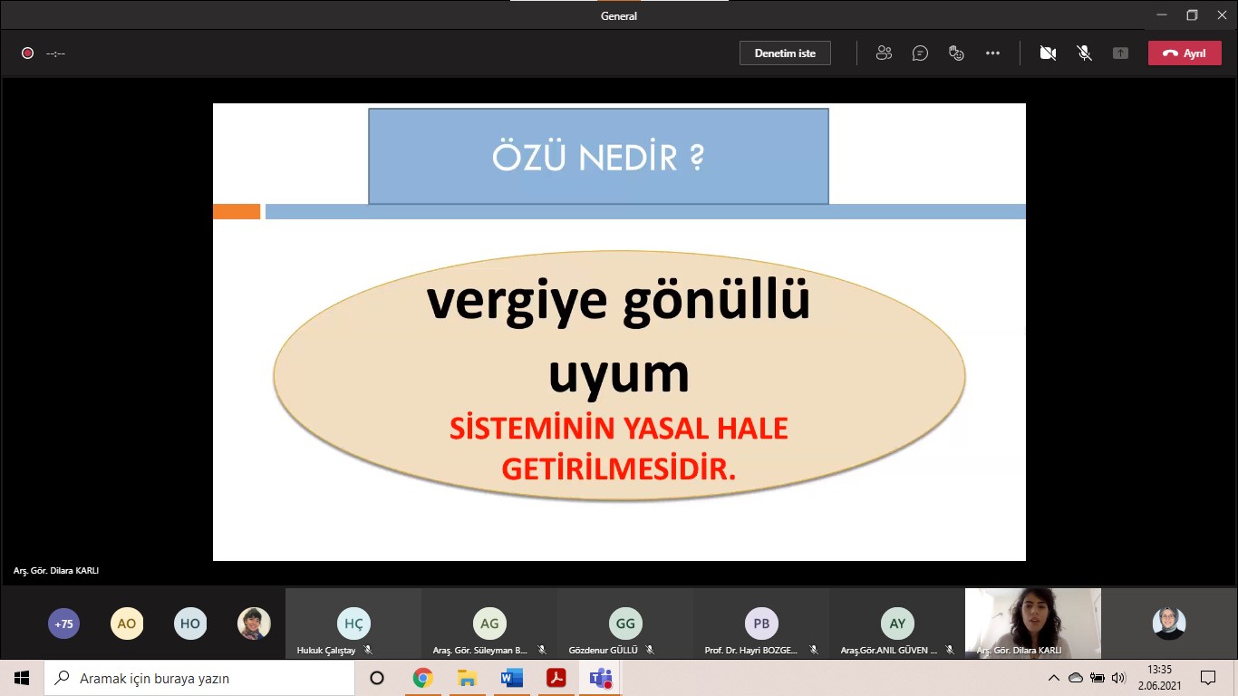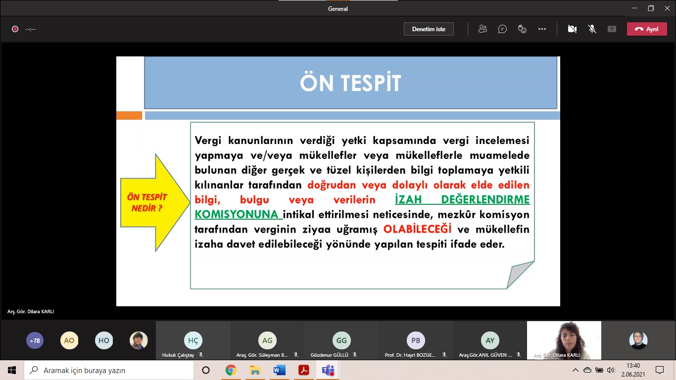 Arş. Gör. Dilara KARLI, sunumunda öncelikle izaha davet müessesesinin özü hakkında bilgi vermiştir. Programın devamında, izaha davetin şartlarına değinilmiştir. Akabinde, izaha davette yetkili kurum ele alınmıştır. Arş. Gör. Dilara KARLI sunumunun devamında ön tespit kavramı ile izaha davette özel işlemlere yer vermiştir.