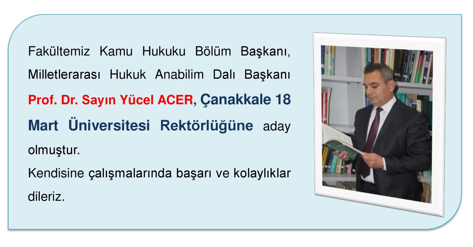 Fakültemiz Kamu Hukuku Bölüm Başkanı, Milletlerarası Hukuk Anabilim Dalı Başkanı Prof. Dr. Sayın Yücel ACER, Çanakkale 18 Mart Üniversitesi Rektörlüğüne aday olmuştur.