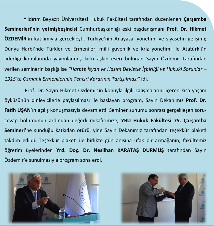YBÜ Hukuk Fakültesi Çarşamba Semineri 75-Harpte İsyan ve Hasım Devletle İşbirliği ve Hukuki Sorunlar - 1915’te Osmanlı Ermenilerinin Tehciri Kararının Tartışılması Adlı Seminer Sunulmuştur.