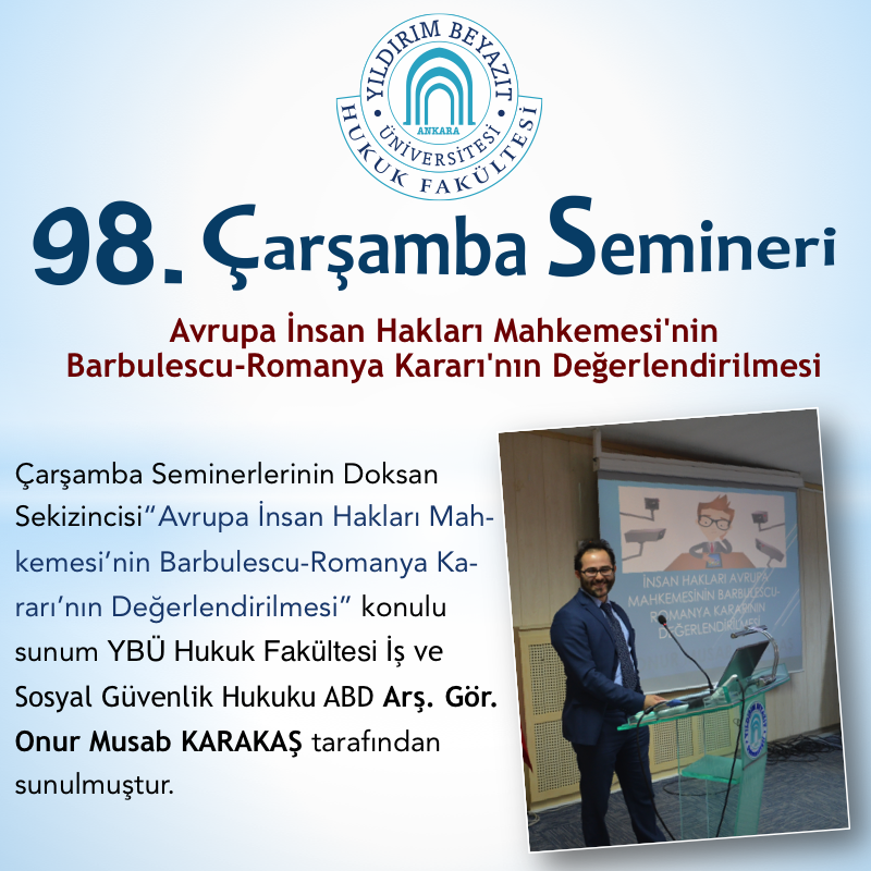 YBÜ Hukuk Fakültesi Çarşamba Semineri 98–Avrupa İnsan Hakları Mahkemesi'nin Barbulescu -Romanya Kararı'nın Değerlendirilmesi Adlı Sunum Gerçekleştirildi.