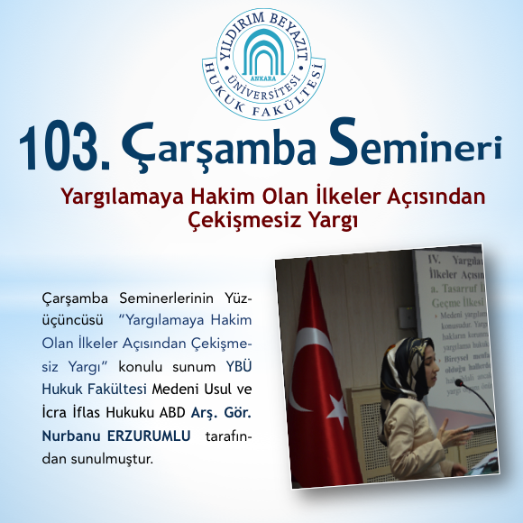 YBÜ Hukuk Fakültesi Çarşamba Semineri 103–Yargılamaya Hakim Olan İlkeler Açısından Çekişmesiz Yargı Adlı Sunum Gerçekleştirilmiştir.