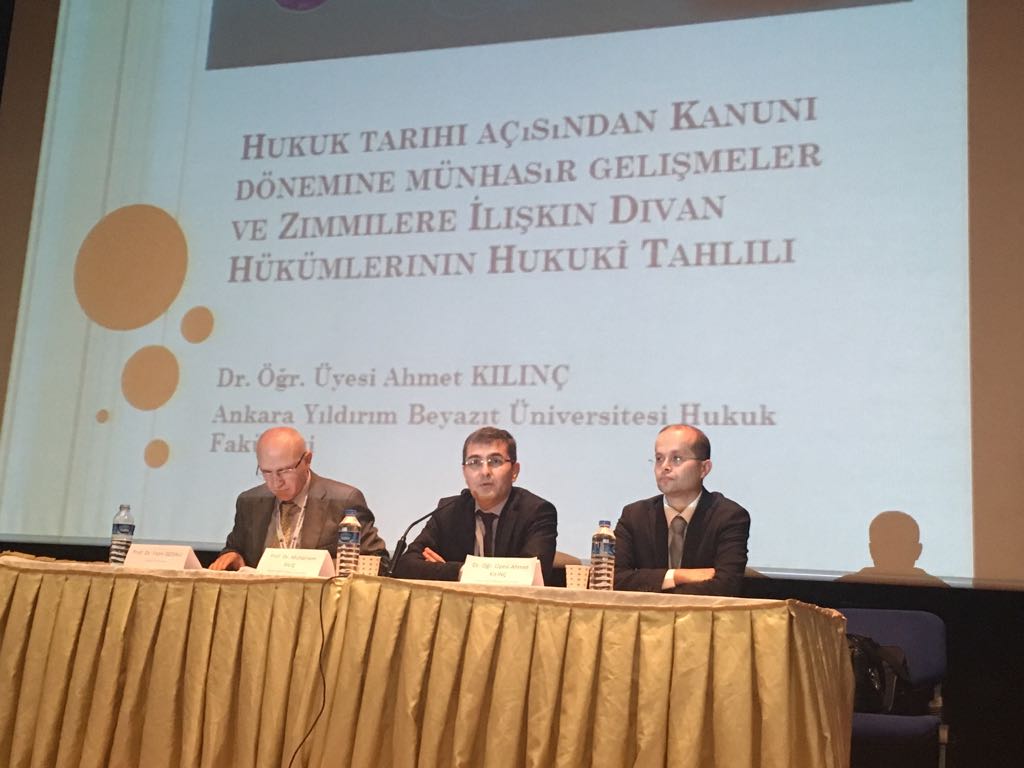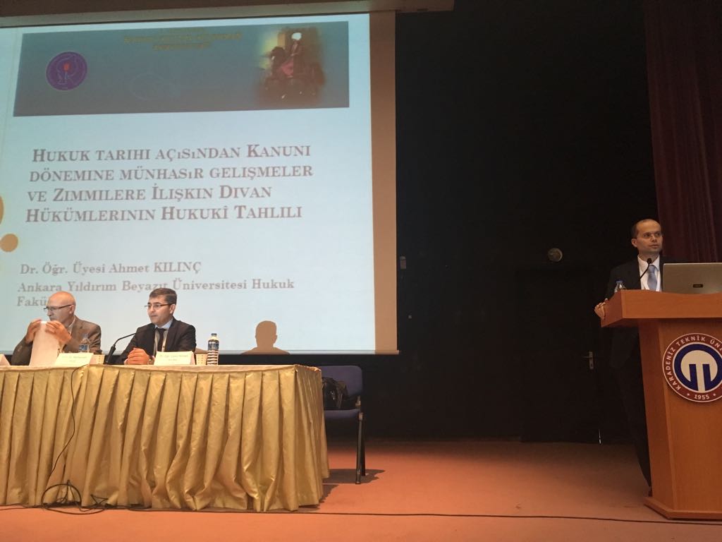 Muhteşem Kanuni Sultan Süleyman Vakfı, Karadeniz Teknik Üniversitesi, Trabzon Valiliği ve Ortahisar Belediyesi tarafından desteklenen ve organize edilen 1. Uluslararası Kanuni Sultan Süleyman Sempozyumu'nda Fakültemiz öğretim üyeleri davetli panelist olarak sunumlarını gerçekleştirmişlerdir. Hukuk Tarihi Açısından Kanuni Sultan Süleyman Panelinde Prof. Dr. Muharrem KILIÇ, "Yasa Hukukunun Tarihi ve Tepolitik Dinamikleri Açısından Şeri Hukuk-Örfi Hukuk İkilemi", Dr. Öğretim Üyesi Ahmet KILINÇ ise "Hukuk Tarihi Açısından Kanuni Dönemine Münhasır Gelişmeler ve Zimmilere İlişkin Divan Hükümlerinin Hukuki Tahlili" tebliğ sunmuşlardır.