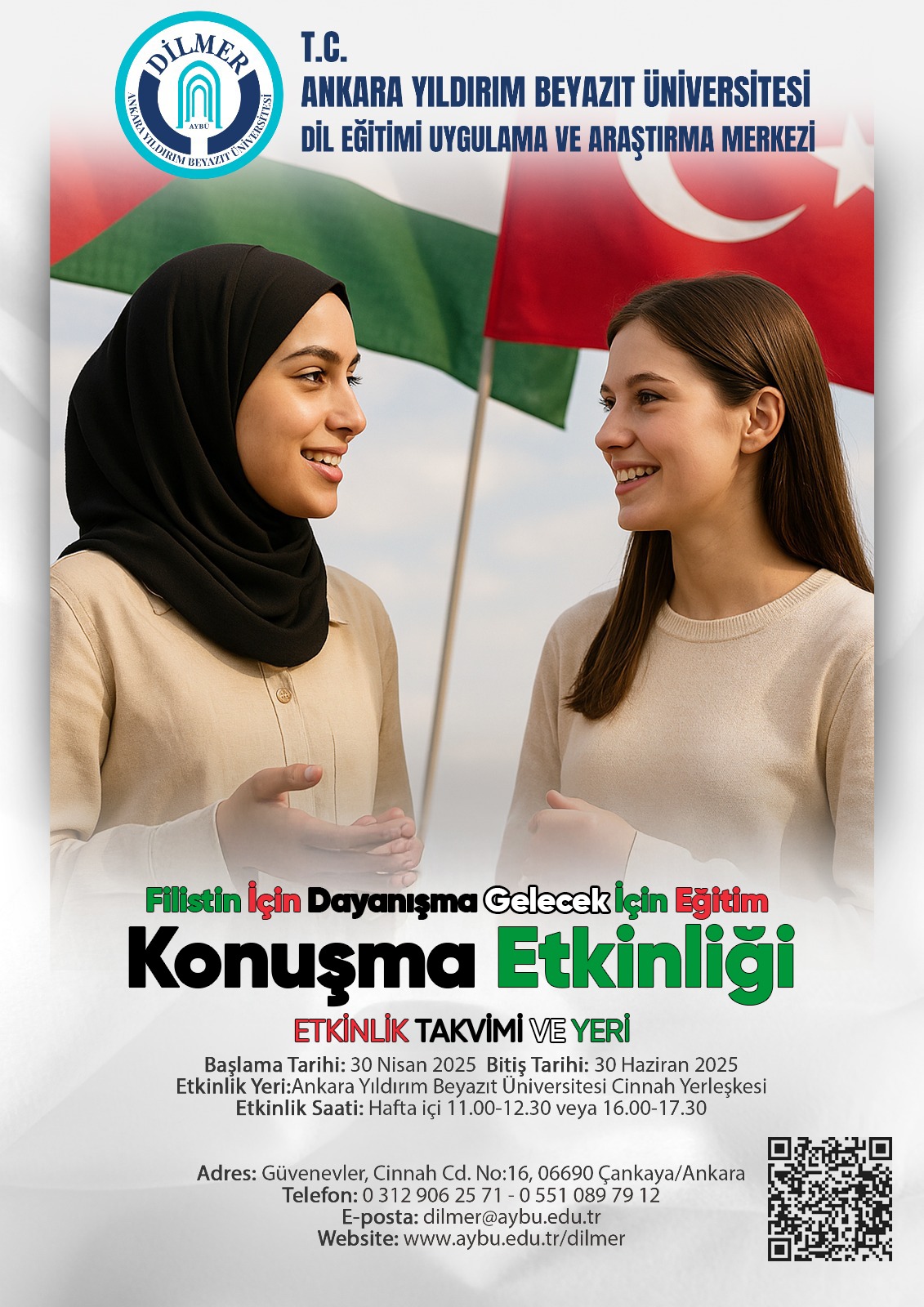 Üniversitemiz Dilmer bünyesindeki Filistinli kursiyerlerin Türkçe konuşma becerilerini geliştirmek ve ülkemize uyum sağlamalarını kolaylaştırmak için 2 aylık bir program yapılacaktır. Konuşma kulübü olarak tasarlanacak programda gönüllü olarak görev almak isteyen Dil ve Konuşma Terapisi, Psikoloji, Sosyoloji, Sosyal Hizmet ve Türk Dili ve Edebiyatı bölümü 3. ve 4. sınıf lisans veya lisansüstü öğrencilerimizin 16-22 Nisan tarihleri arasında Cinnah yerleşkesinde hafta içi 17.30-20.40 saatleri arasında yapılacak ücretsiz eğitim programlarına katılması gerekmektedir. Eğitime katılan öğrencilerimiz belirlenecek programa göre hafta içi  2 saat bire bir konuşma etkinliği yapacaktır.